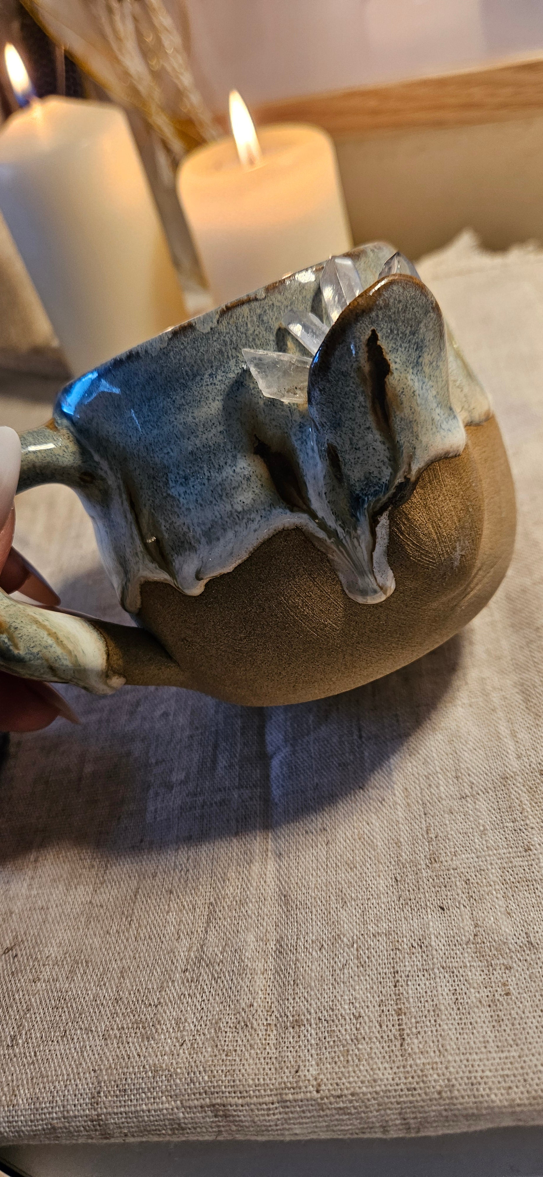 Jeder Becher und Tasse werden von mir in liebevoller Handarbeit auf der Drehscheibe gedreht, von Hand glasiert und anschließend im Brennofen gebrannt. Ich stelle überwiegend Spirituelle Keramik her. In meinen hoch Meditativen Arbeitsprozessen, fließen Weltthemen mit mir und durch mich hindurch. Diese macht sie geradezu ganz besonders und zu einem absoluten kraftvollen Schatz.