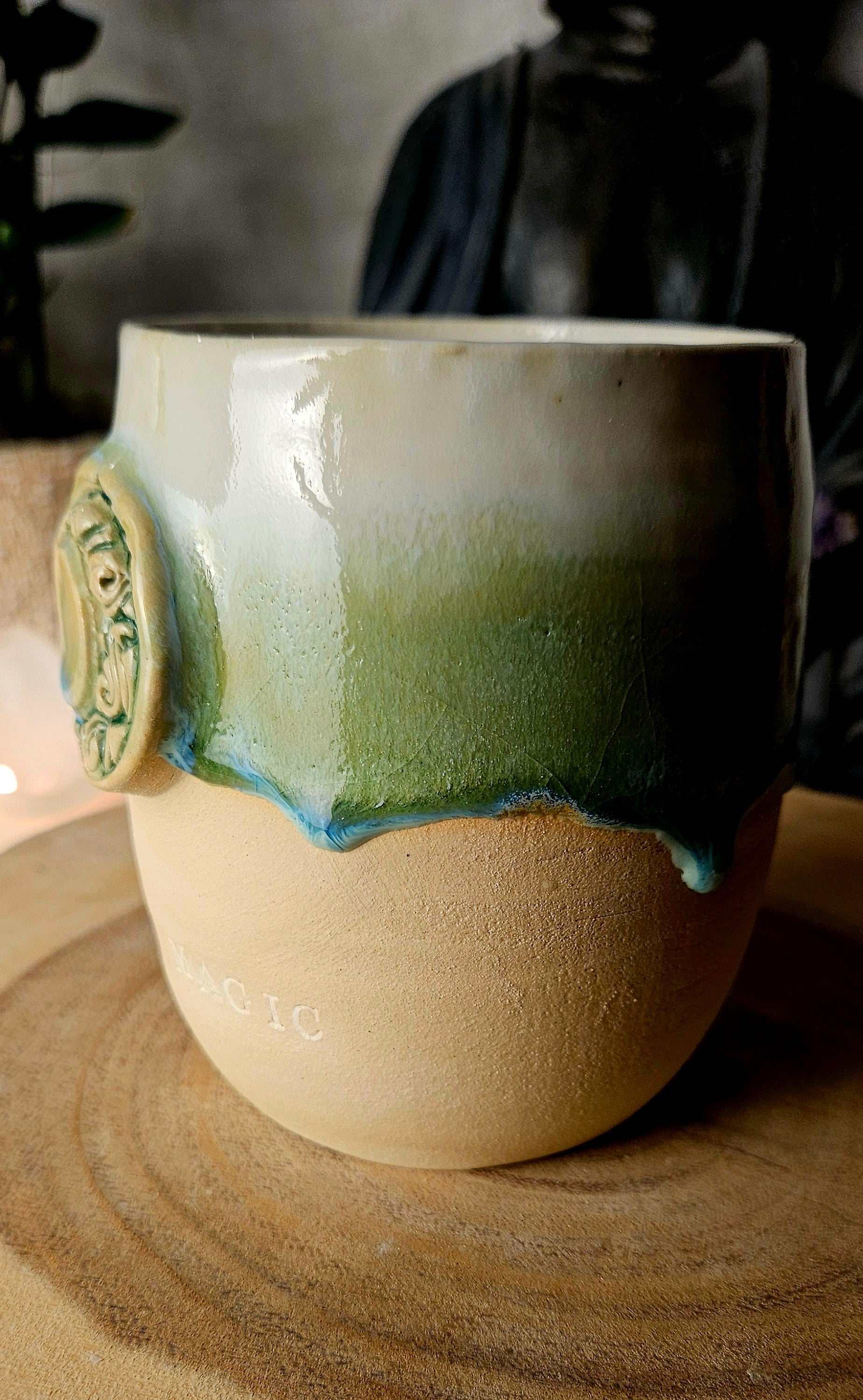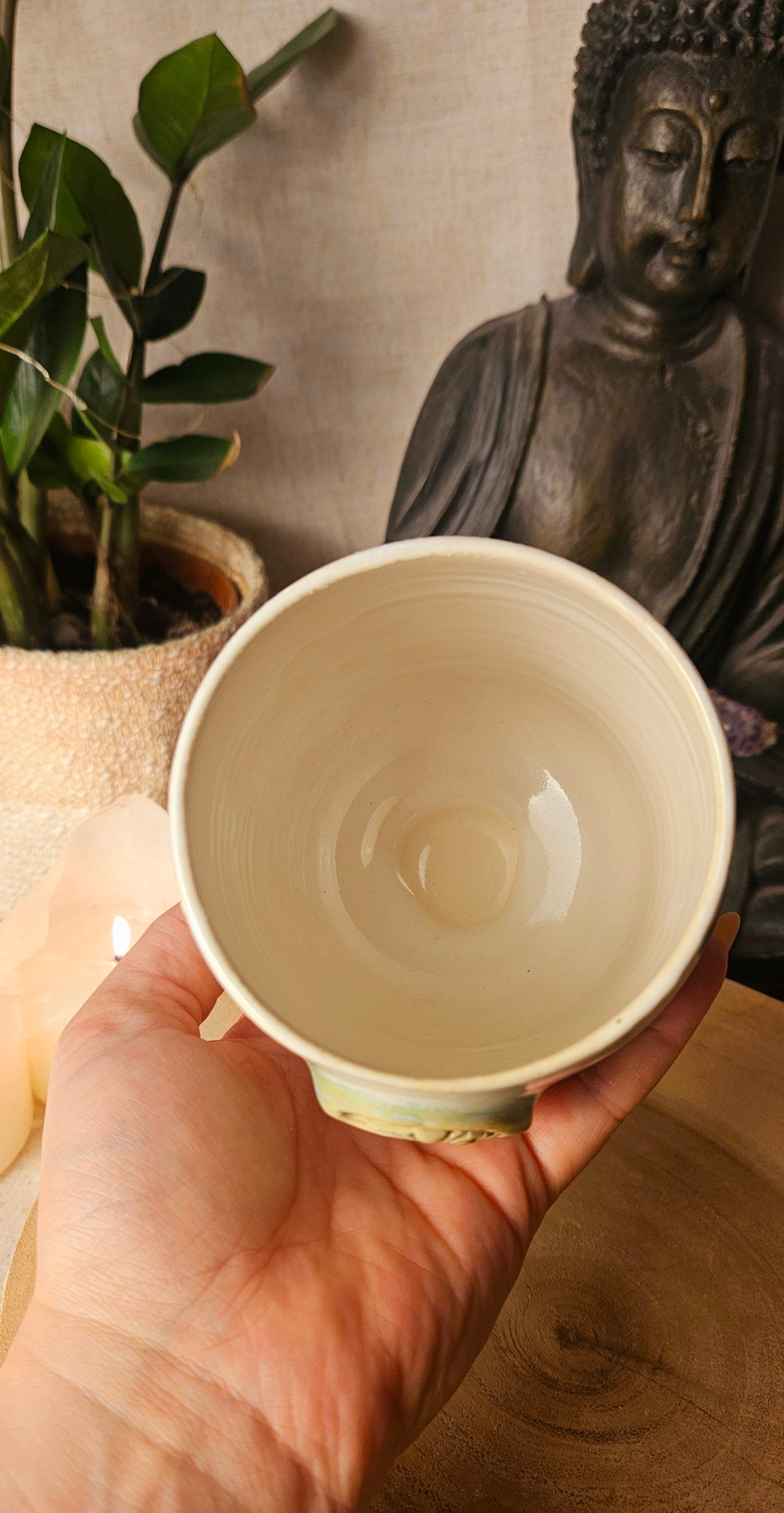 Jeder Becher und Tasse werden von mir in liebevoller Handarbeit auf der Drehscheibe gedreht, von Hand glasiert und anschließend im Brennofen gebrannt. Ich stelle überwiegend Spirituelle Keramik her. In meinen hoch Meditativen Arbeitsprozessen, fließen Weltthemen mit mir und durch mich hindurch. Diese macht sie geradezu ganz besonders und zu einem absoluten kraftvollen Schatz.