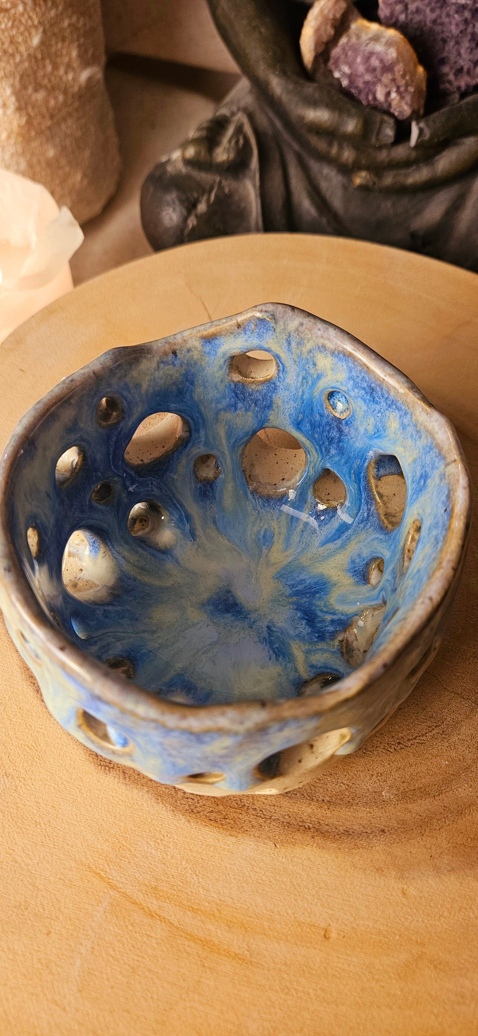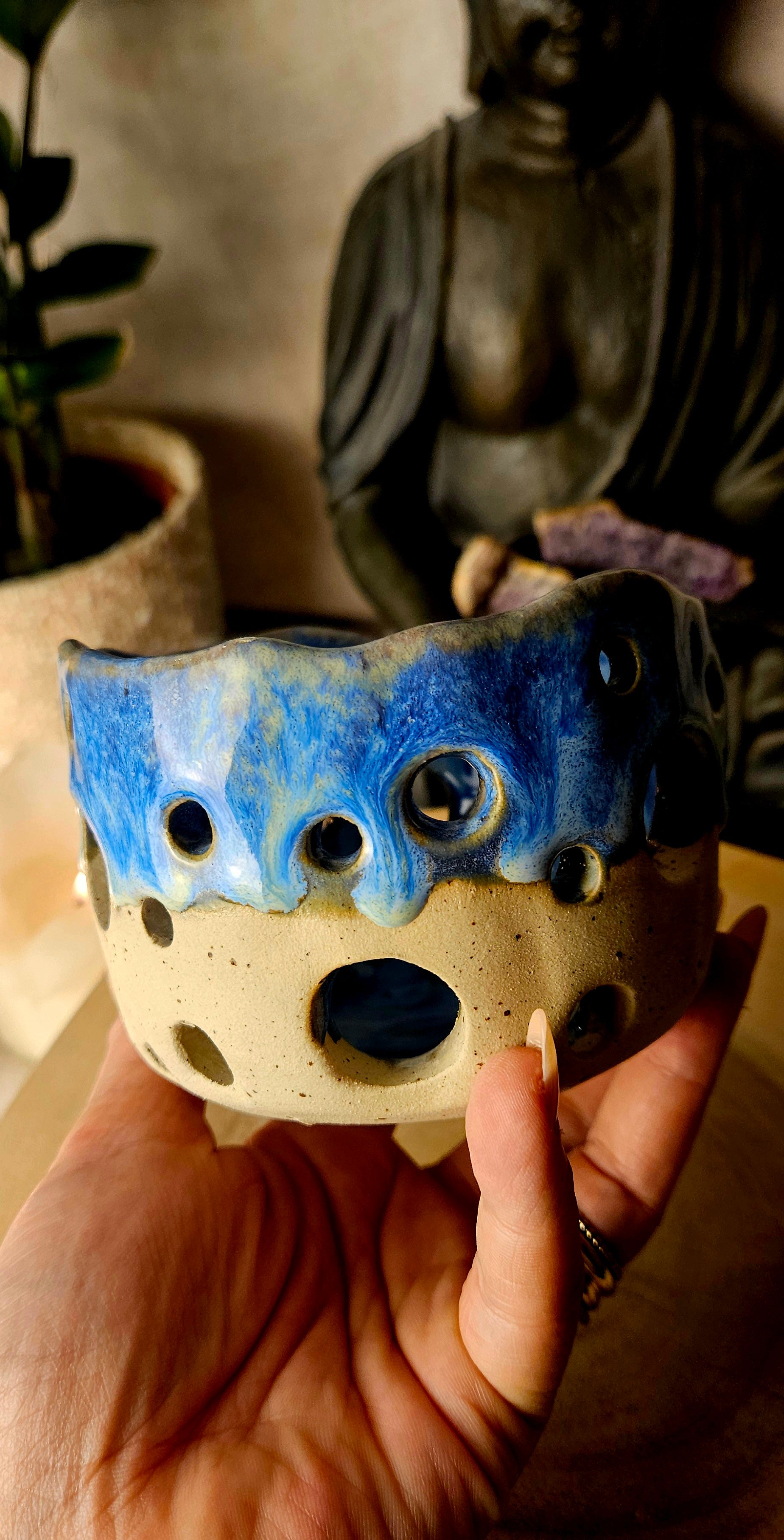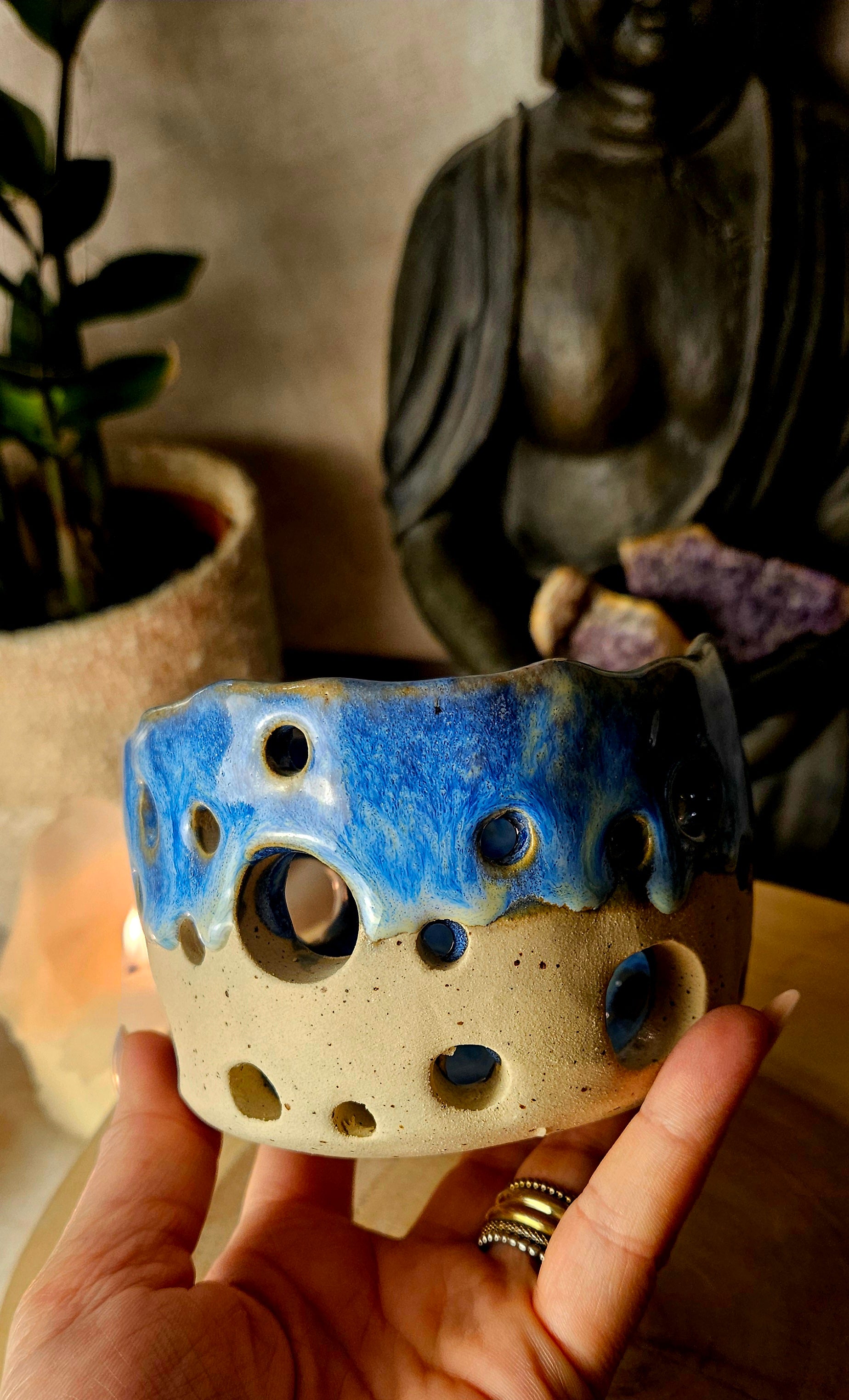 Jeder Becher und Tasse werden von mir in liebevoller Handarbeit auf der Drehscheibe gedreht, von Hand glasiert und anschließend im Brennofen gebrannt. Ich stelle überwiegend Spirituelle Keramik her. In meinen hoch Meditativen Arbeitsprozessen, fließen Weltthemen mit mir und durch mich hindurch. Diese macht sie geradezu ganz besonders und zu einem absoluten kraftvollen Schatz.