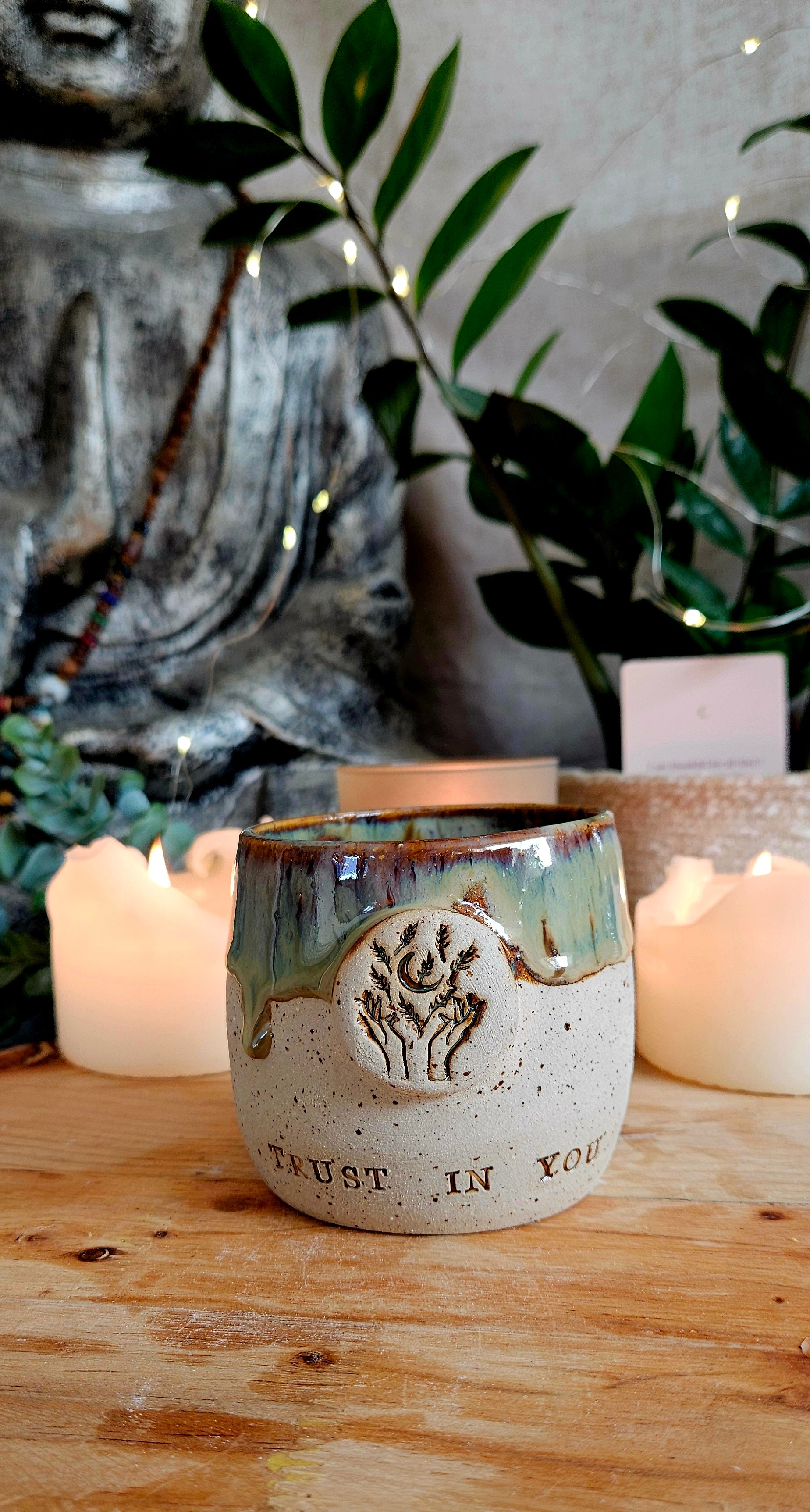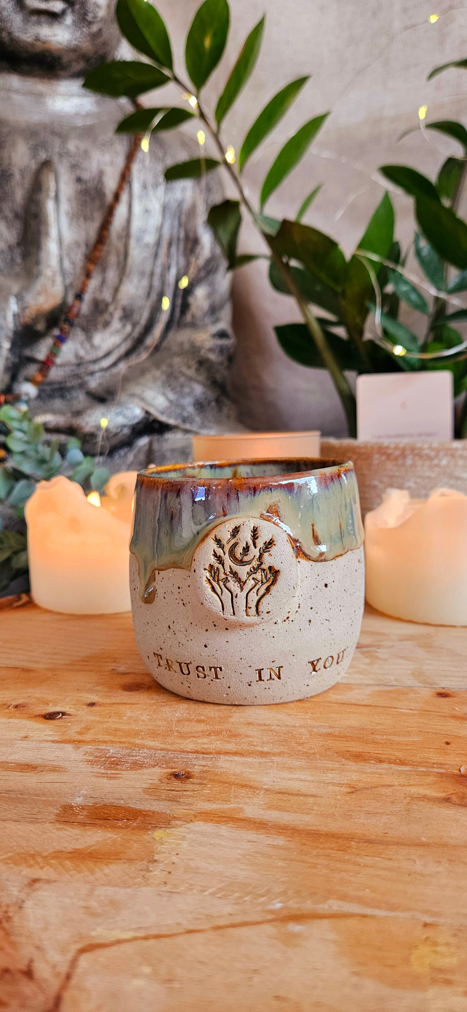 Jeder Becher und Tasse werden von mir in liebevoller Handarbeit auf der Drehscheibe gedreht, von Hand glasiert und anschließend im Brennofen gebrannt. Ich stelle überwiegend Spirituelle Keramik her. In meinen hoch Meditativen Arbeitsprozessen, fließen Weltthemen mit mir und durch mich hindurch. Diese macht sie geradezu ganz besonders und zu einem absoluten kraftvollen Schatz.