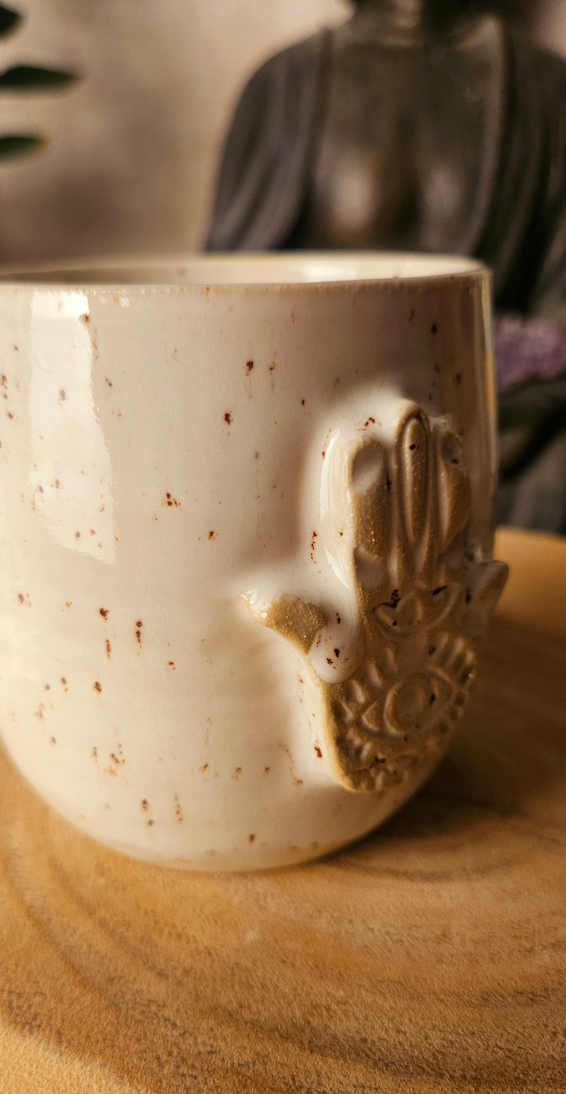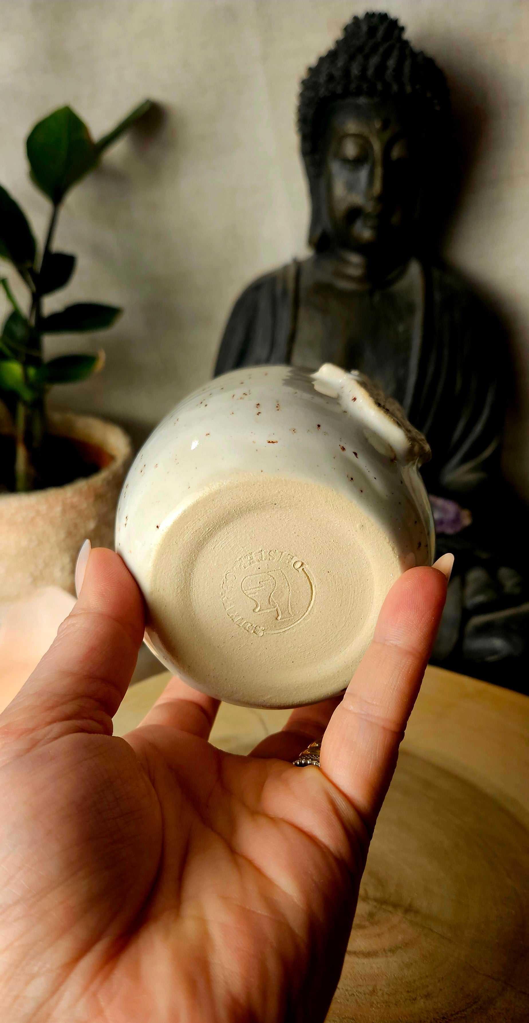 Jeder Becher und Tasse werden von mir in liebevoller Handarbeit auf der Drehscheibe gedreht, von Hand glasiert und anschließend im Brennofen gebrannt. Ich stelle überwiegend Spirituelle Keramik her. In meinen hoch Meditativen Arbeitsprozessen, fließen Weltthemen mit mir und durch mich hindurch. Diese macht sie geradezu ganz besonders und zu einem absoluten kraftvollen Schatz.