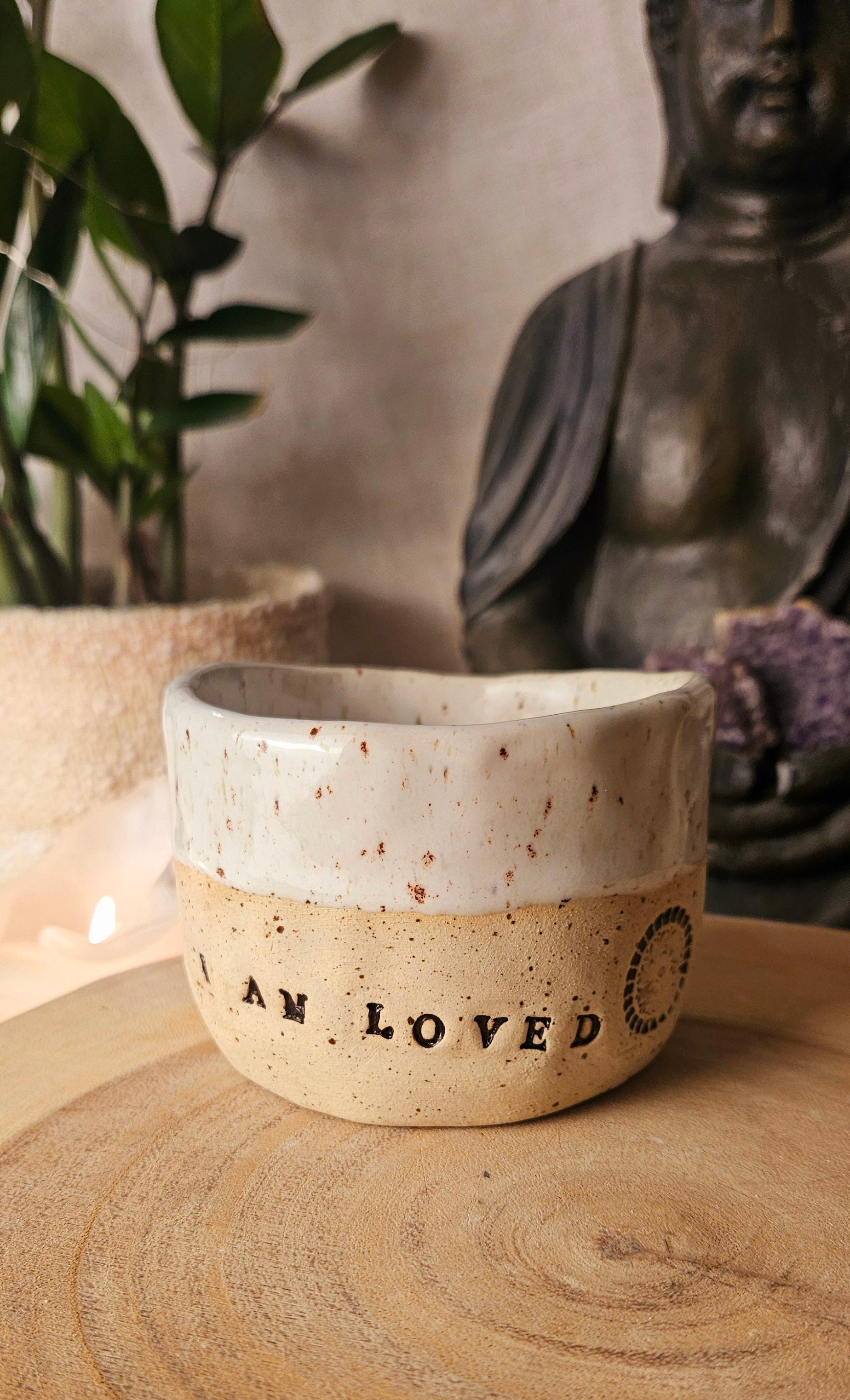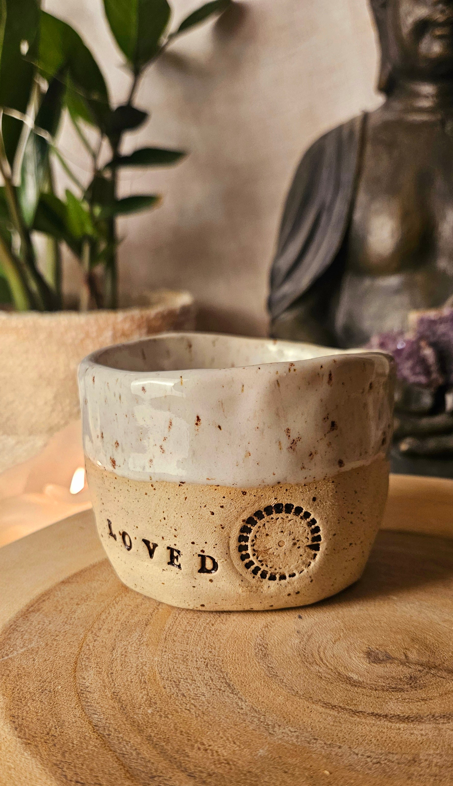 Jeder Becher und Tasse werden von mir in liebevoller Handarbeit auf der Drehscheibe gedreht, von Hand glasiert und anschließend im Brennofen gebrannt. Ich stelle überwiegend Spirituelle Keramik her.  In meinen  hoch Meditativen Arbeitsprozessen, fließen Weltthemen mit mir und durch mich hindurch. Diese macht sie geradezu ganz besonders und zu einem absoluten kraftvollen Schatz.
