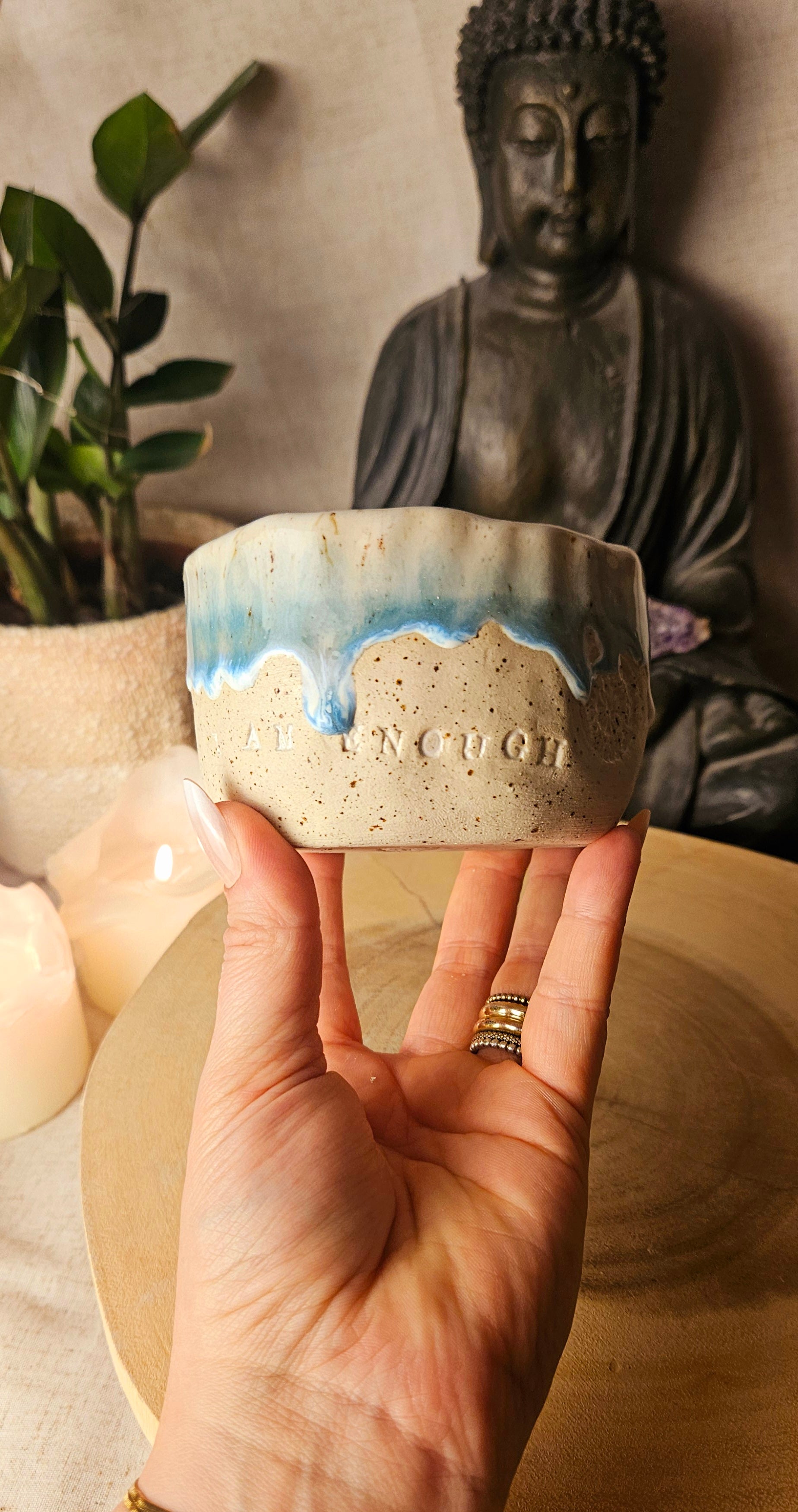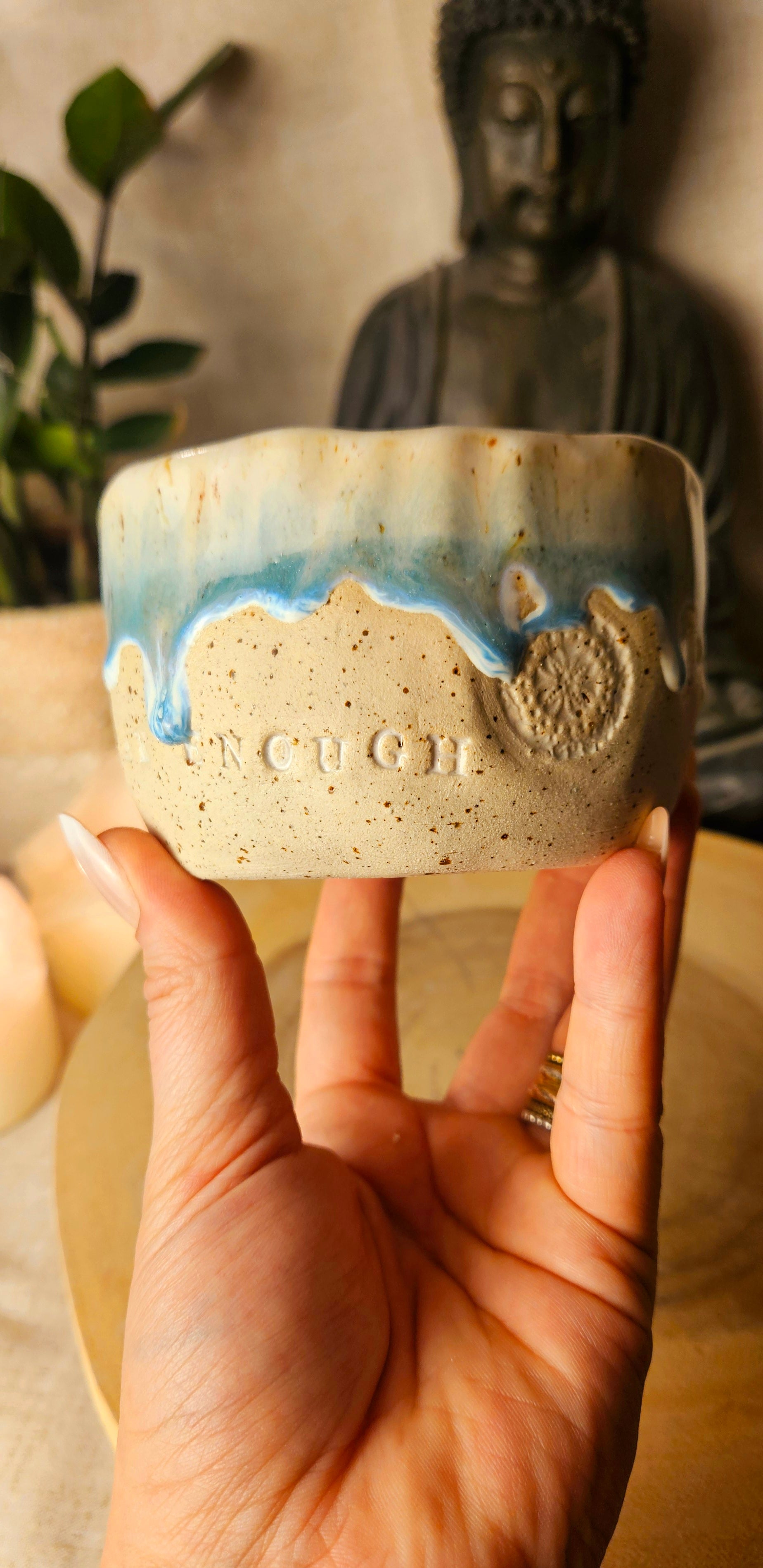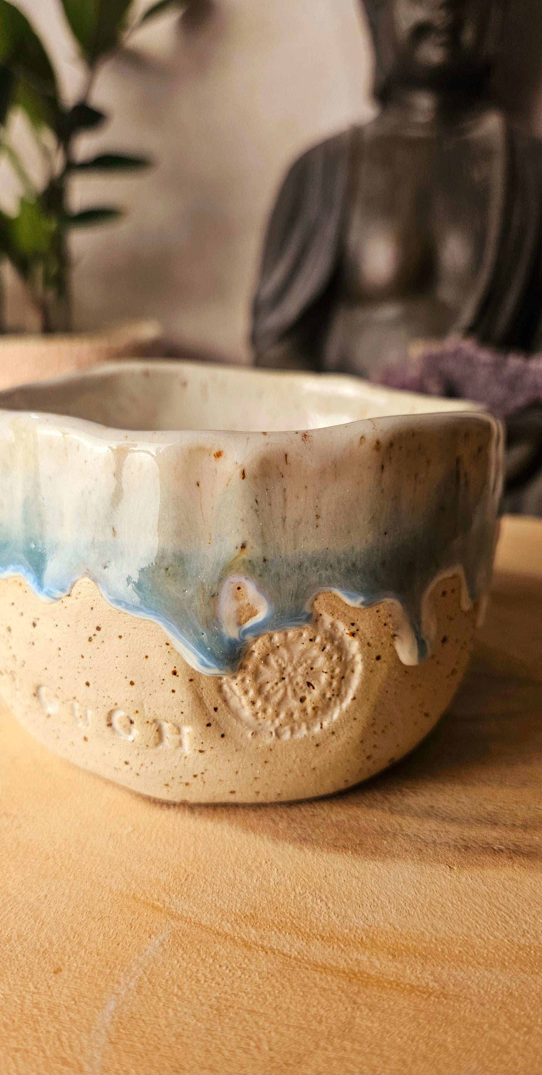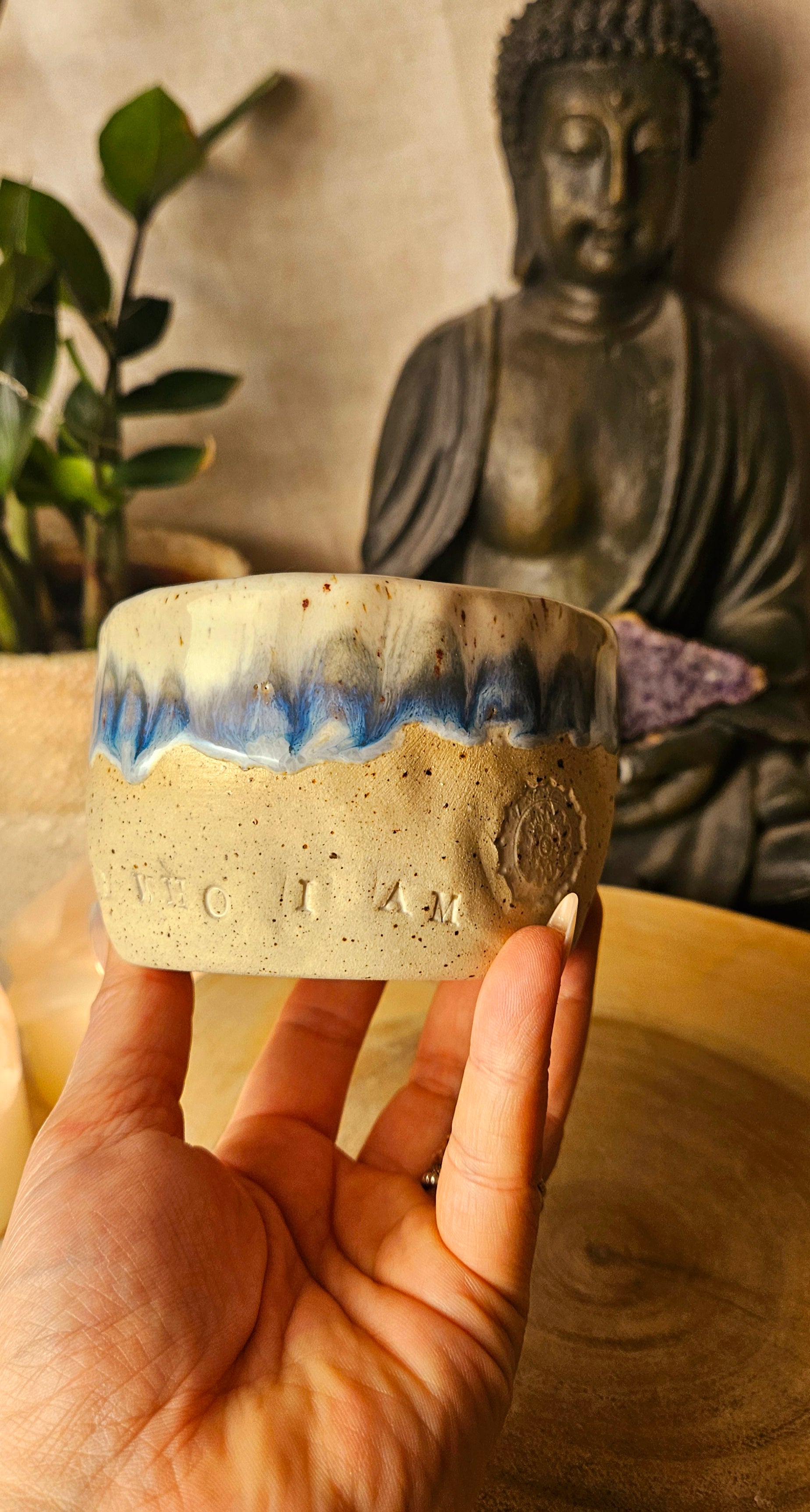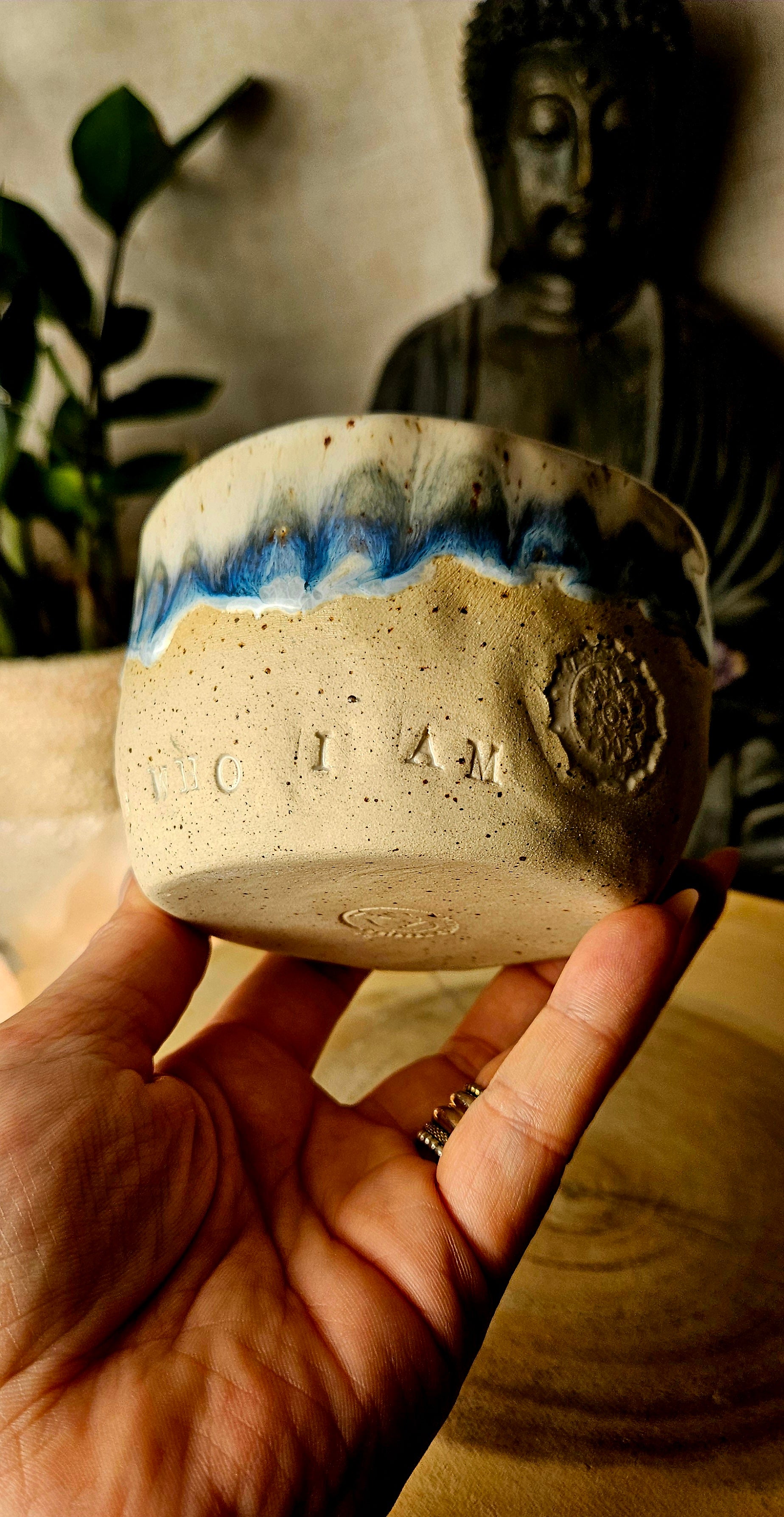 Jeder Becher und Tasse werden von mir in liebevoller Handarbeit auf der Drehscheibe gedreht, von Hand glasiert und anschließend im Brennofen gebrannt. Ich stelle überwiegend Spirituelle Keramik her. In meinen hoch Meditativen Arbeitsprozessen, fließen Weltthemen mit mir und durch mich hindurch. Diese macht sie geradezu ganz besonders und zu einem absoluten kraftvollen Schatz.