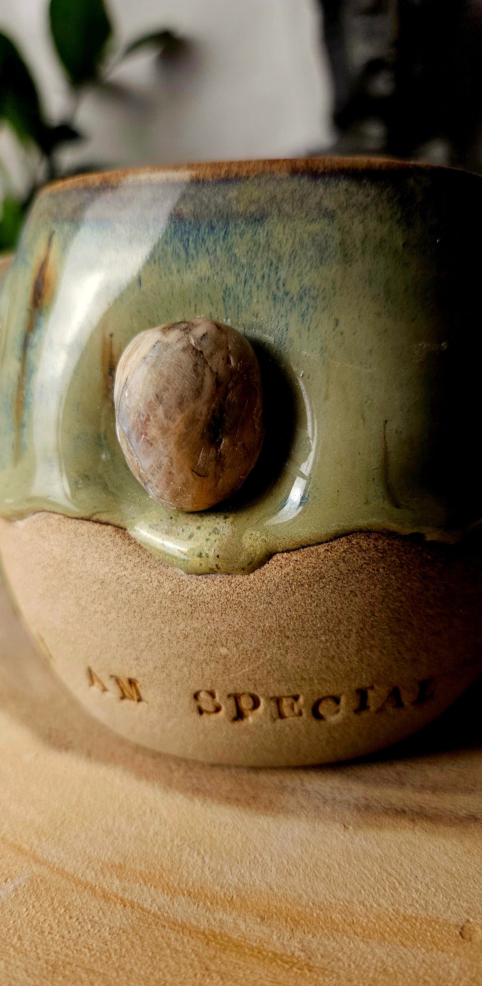 Jeder Becher und Tasse werden von mir in liebevoller Handarbeit auf der Drehscheibe gedreht, von Hand glasiert und anschließend im Brennofen gebrannt. Ich stelle überwiegend Spirituelle Keramik her. In meinen hoch Meditativen Arbeitsprozessen, fließen Weltthemen mit mir und durch mich hindurch. Diese macht sie geradezu ganz besonders und zu einem absoluten kraftvollen Schatz.