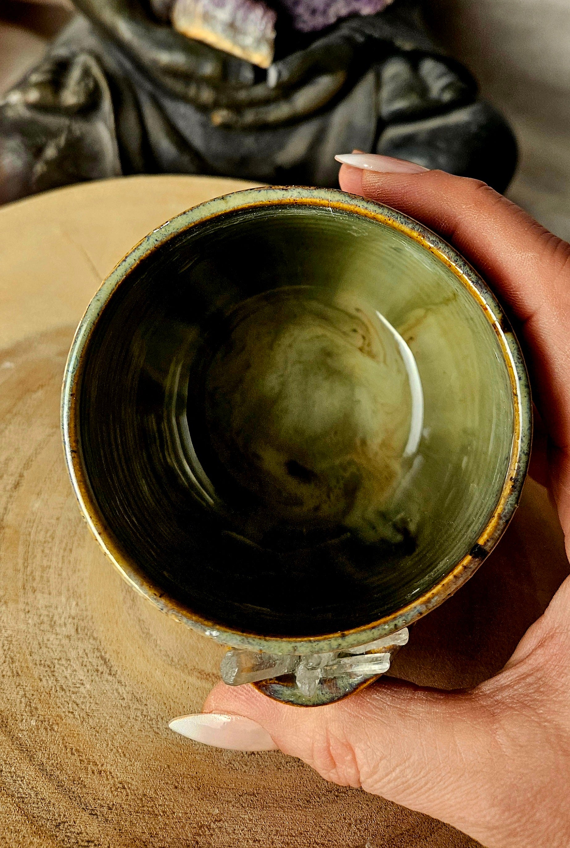 Jeder Becher und Tasse werden von mir in liebevoller Handarbeit auf der Drehscheibe gedreht, von Hand glasiert und anschließend im Brennofen gebrannt. Ich stelle überwiegend Spirituelle Keramik her. In meinen hoch Meditativen Arbeitsprozessen, fließen Weltthemen mit mir und durch mich hindurch. Diese macht sie geradezu ganz besonders und zu einem absoluten kraftvollen Schatz.
