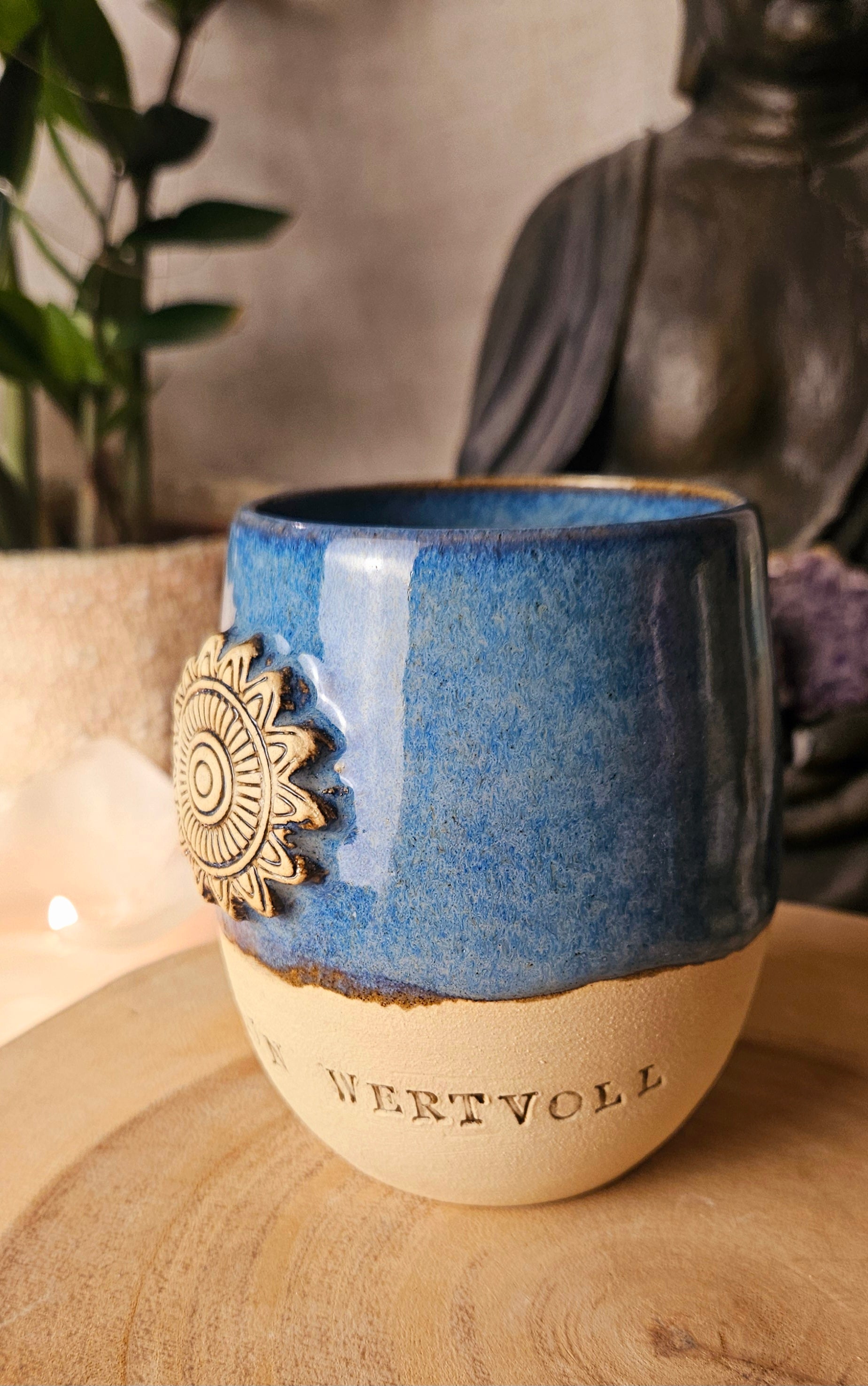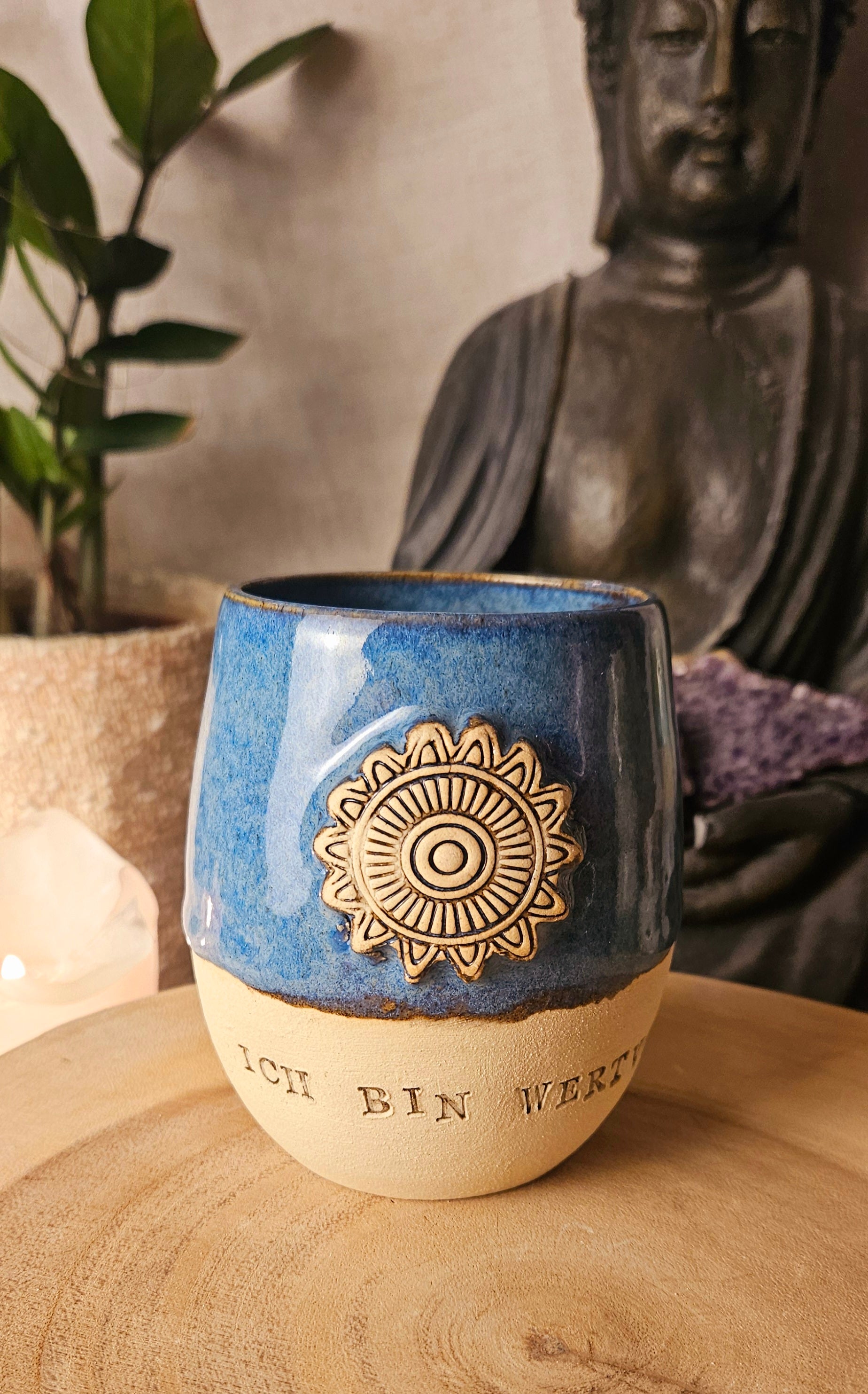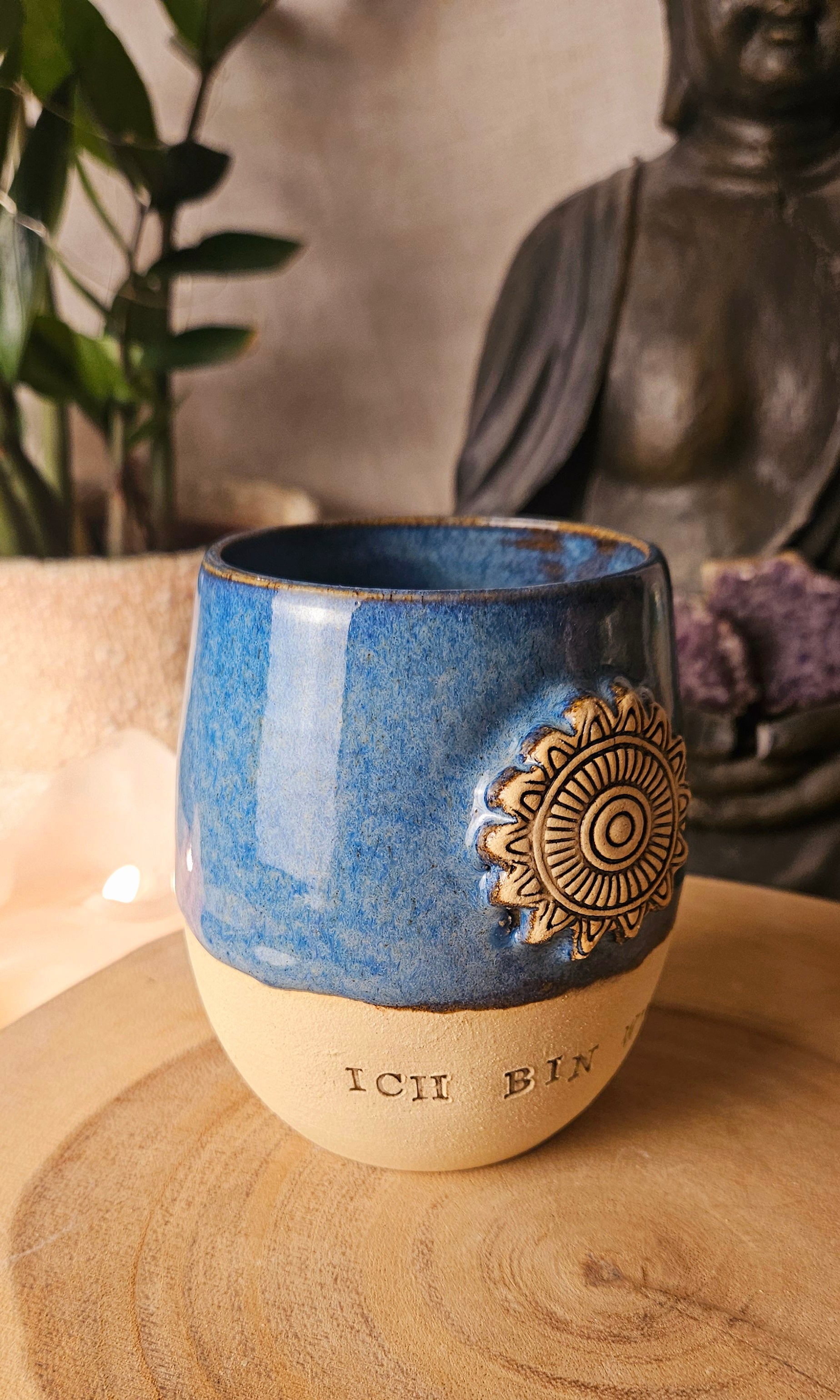 Jeder Becher und Tasse werden von mir in liebevoller Handarbeit auf der Drehscheibe gedreht, von Hand glasiert und anschließend im Brennofen gebrannt. Ich stelle überwiegend Spirituelle Keramik her. In meinen hoch Meditativen Arbeitsprozessen, fließen Weltthemen mit mir und durch mich hindurch. Diese macht sie geradezu ganz besonders und zu einem absoluten kraftvollen Schatz.
