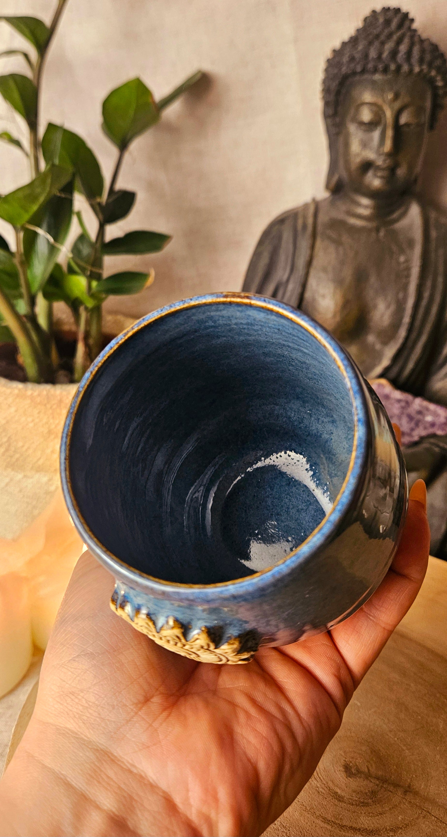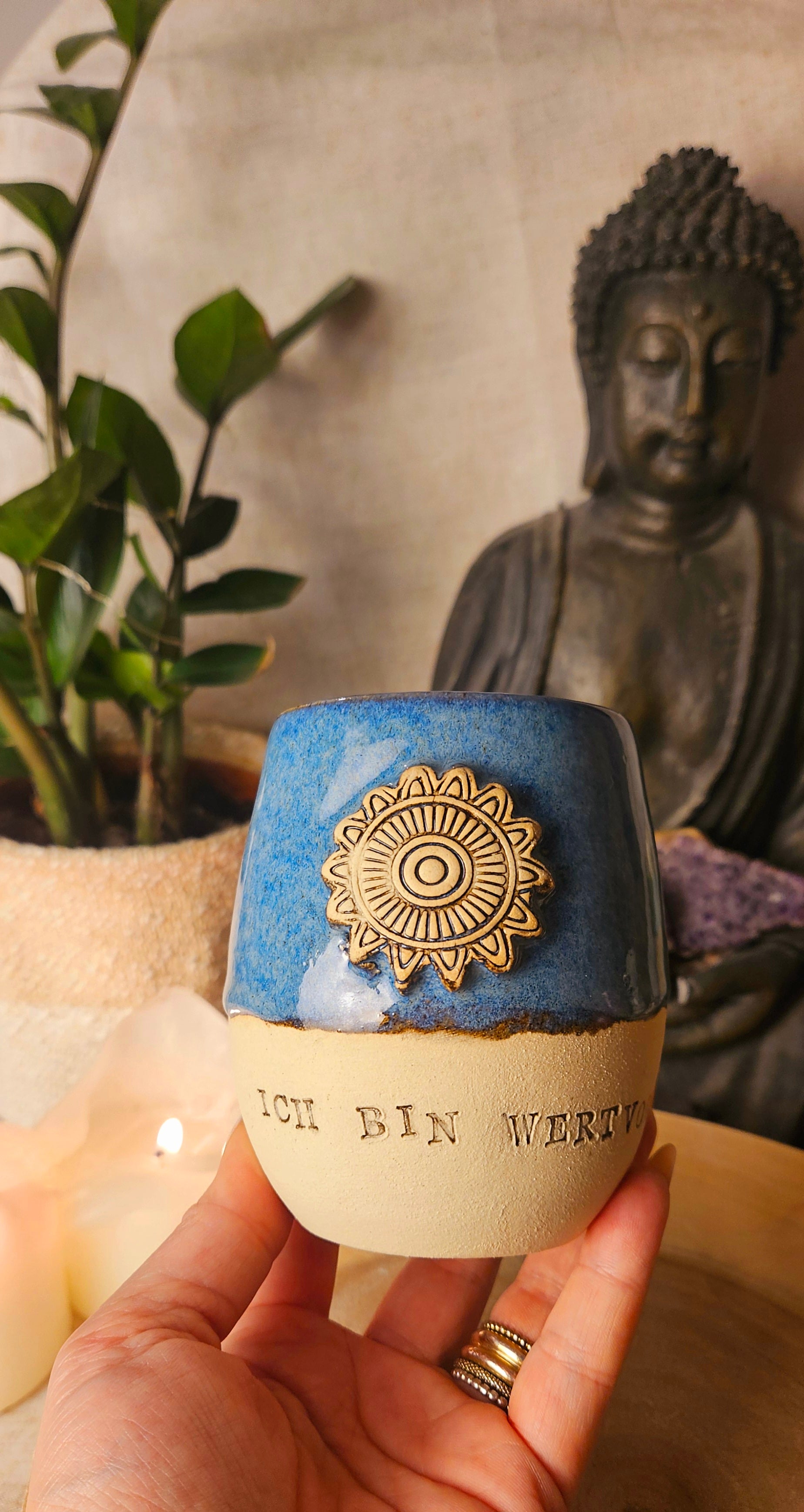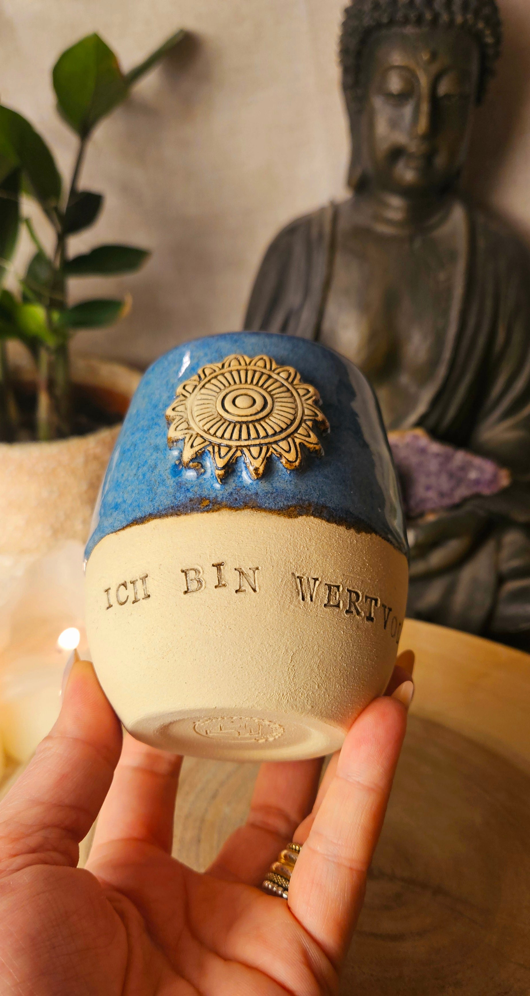 Jeder Becher und Tasse werden von mir in liebevoller Handarbeit auf der Drehscheibe gedreht, von Hand glasiert und anschließend im Brennofen gebrannt. Ich stelle überwiegend Spirituelle Keramik her. In meinen hoch Meditativen Arbeitsprozessen, fließen Weltthemen mit mir und durch mich hindurch. Diese macht sie geradezu ganz besonders und zu einem absoluten kraftvollen Schatz.