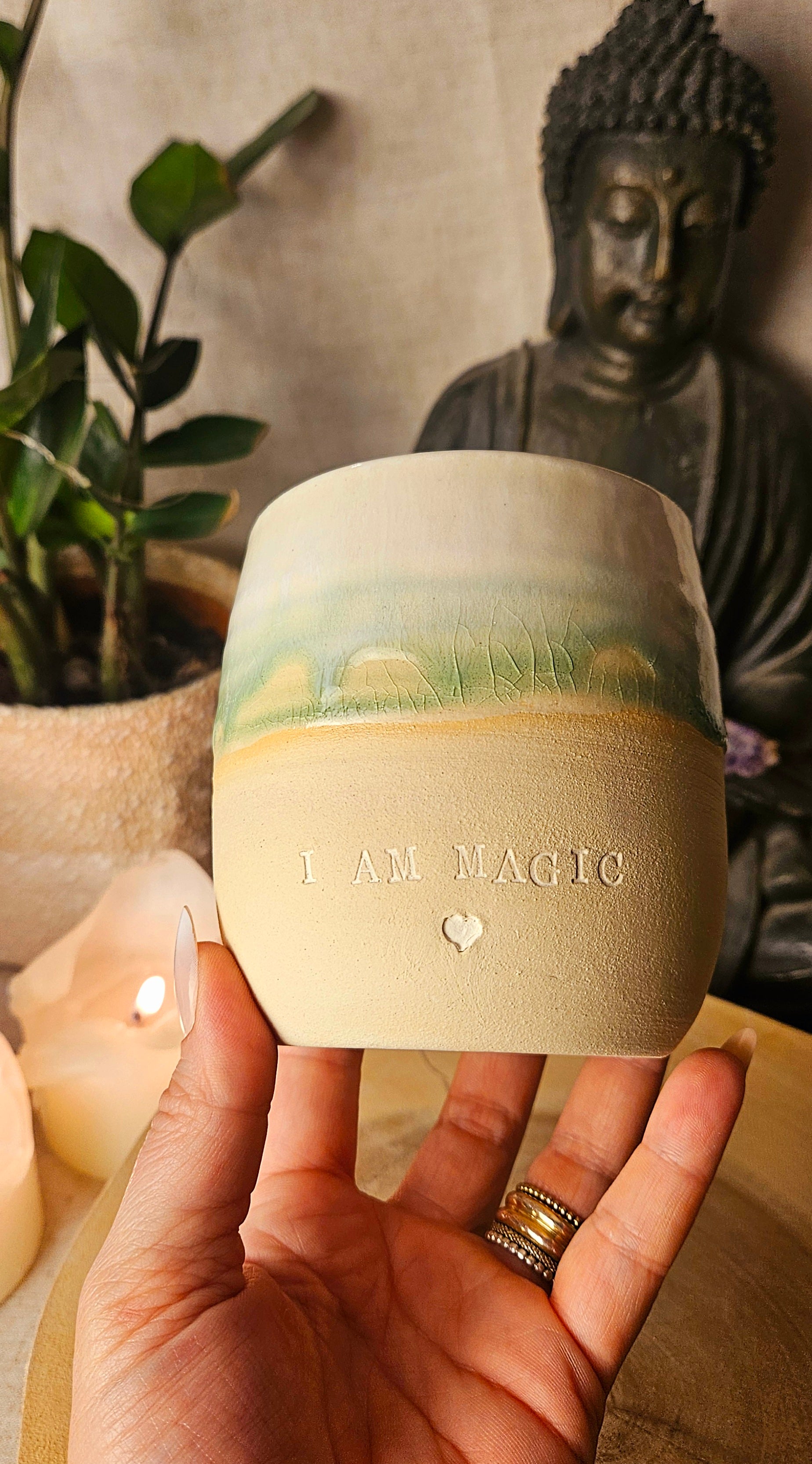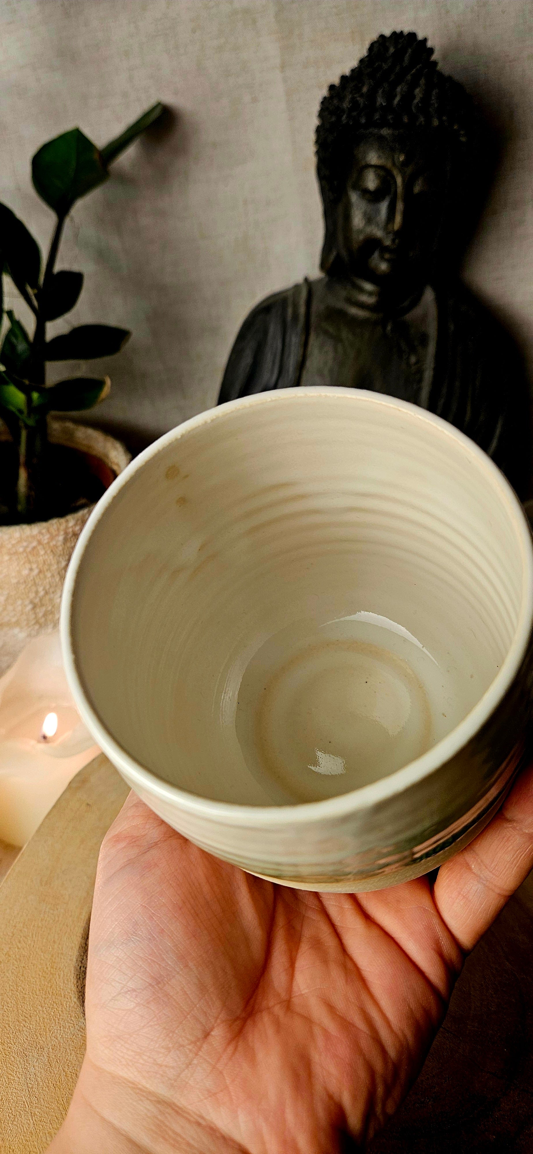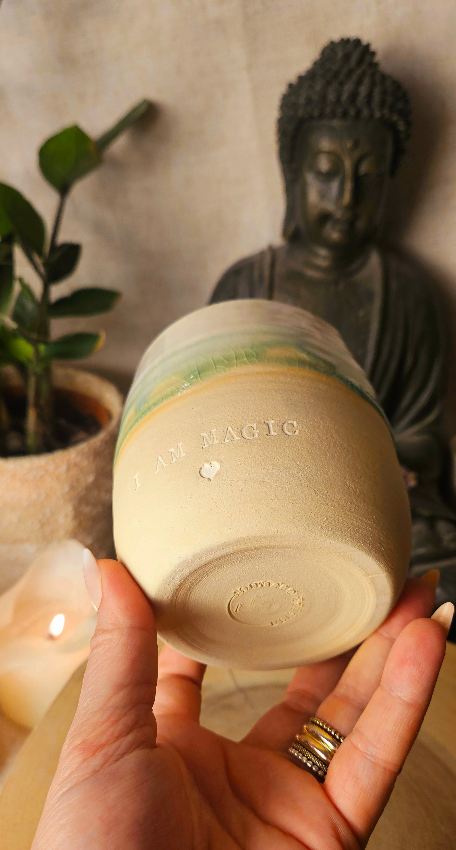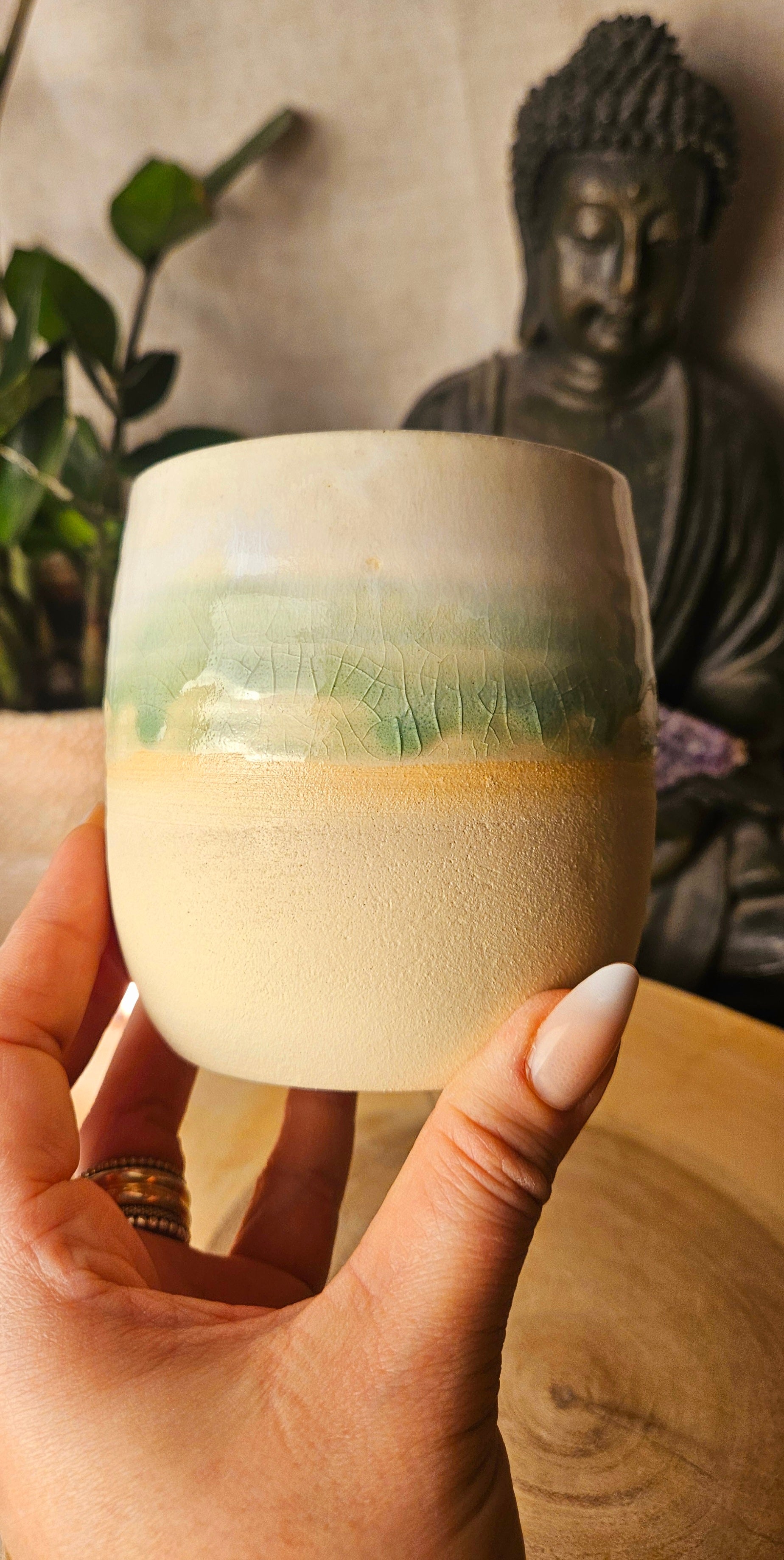 Jeder Becher und Tasse werden von mir in liebevoller Handarbeit auf der Drehscheibe gedreht, von Hand glasiert und anschließend im Brennofen gebrannt. Ich stelle überwiegend Spirituelle Keramik her. In meinen hoch Meditativen Arbeitsprozessen, fließen Weltthemen mit mir und durch mich hindurch. Diese macht sie geradezu ganz besonders und zu einem absoluten kraftvollen Schatz.