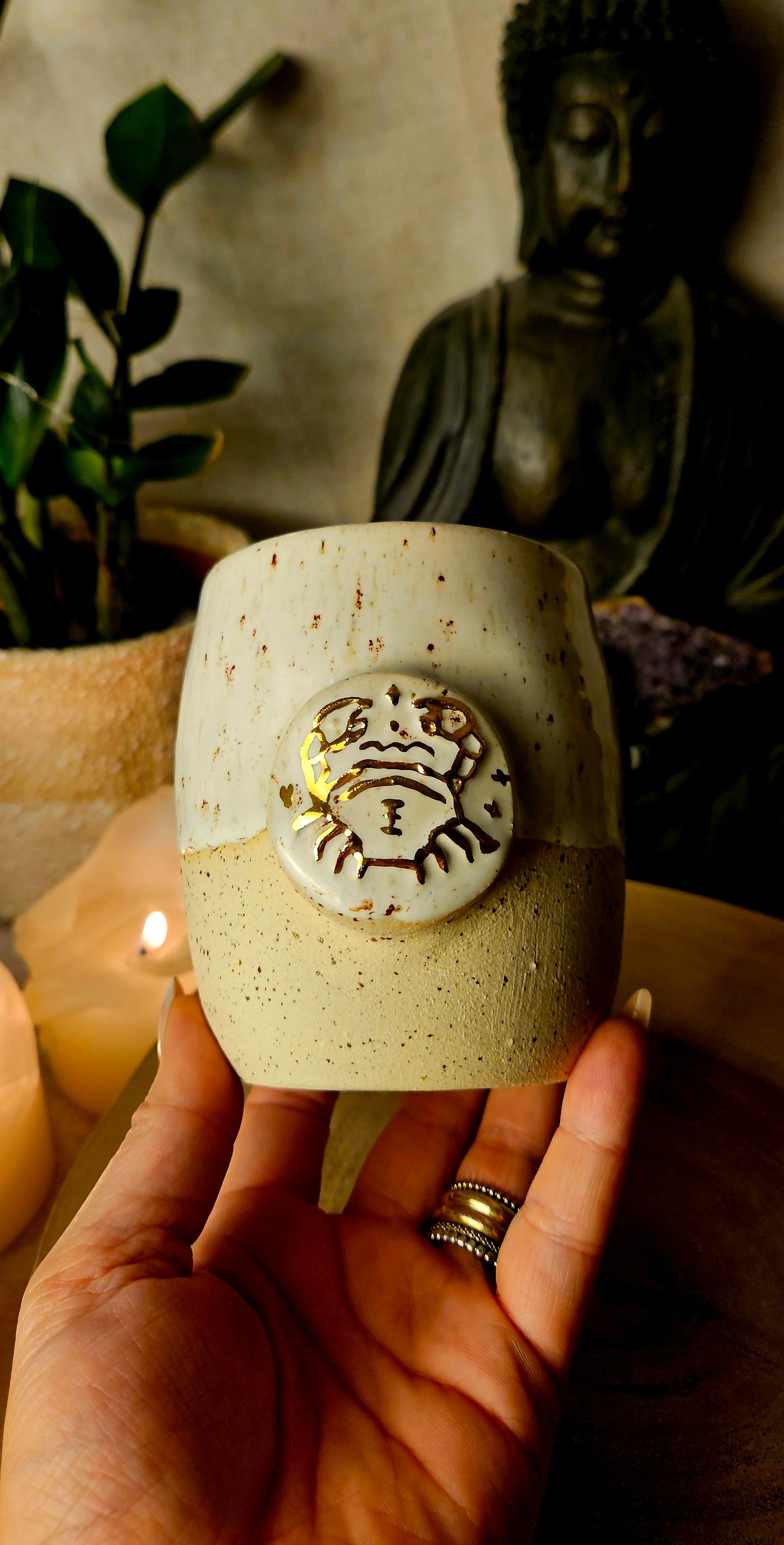 Jeder Becher und Tasse werden von mir in liebevoller Handarbeit auf der Drehscheibe gedreht, von Hand glasiert und anschließend im Brennofen gebrannt. Ich stelle überwiegend Spirituelle Keramik her. In meinen hoch Meditativen Arbeitsprozessen, fließen Weltthemen mit mir und durch mich hindurch. Diese macht sie geradezu ganz besonders und zu einem absoluten kraftvollen Schatz.