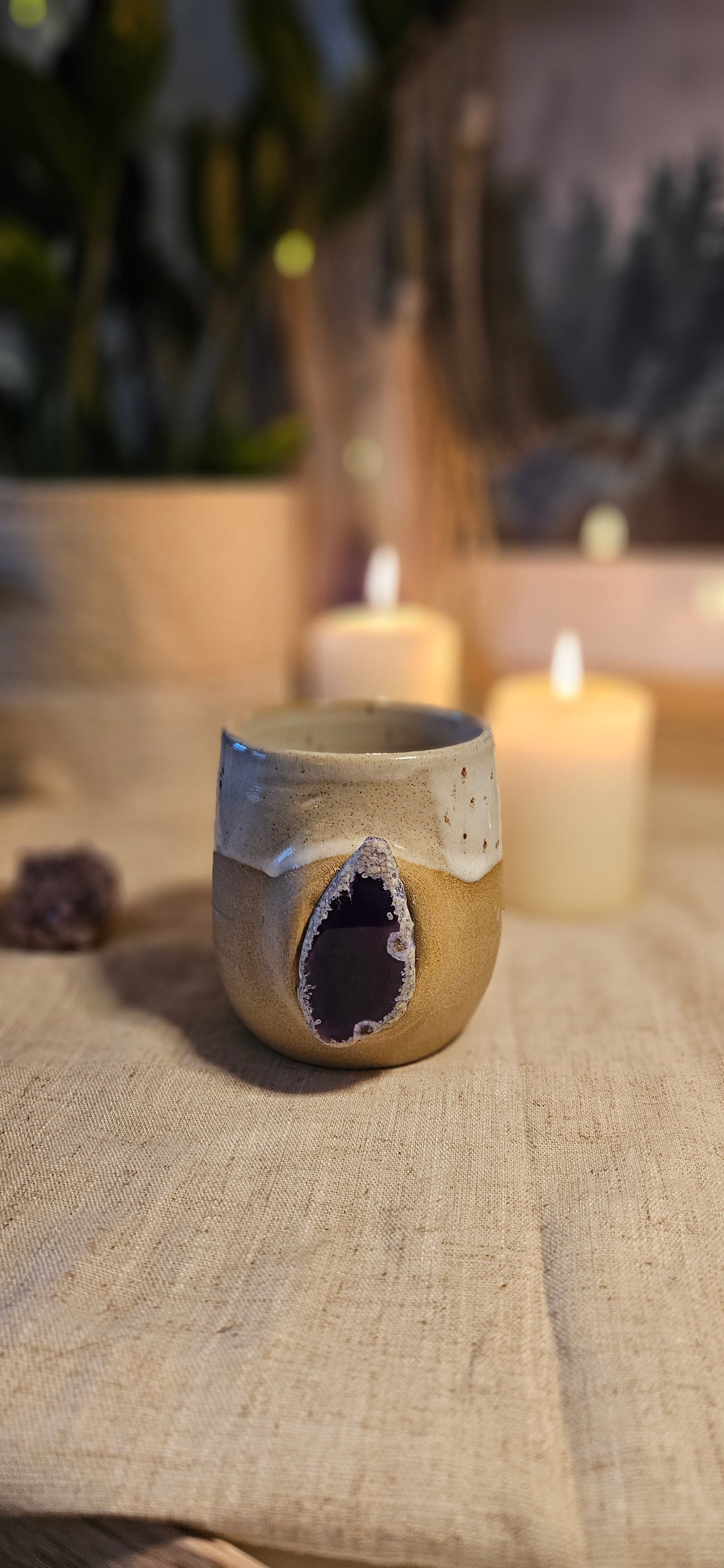 Jeder Becher und Tasse werden von mir in liebevoller Handarbeit auf der Drehscheibe gedreht, von Hand glasiert und anschließend im Brennofen gebrannt. Ich stelle überwiegend Spirituelle Keramik her. In meinen hoch Meditativen Arbeitsprozessen, fließen Weltthemen mit mir und durch mich hindurch. Diese macht sie geradezu ganz besonders und zu einem absoluten kraftvollen Schatz.