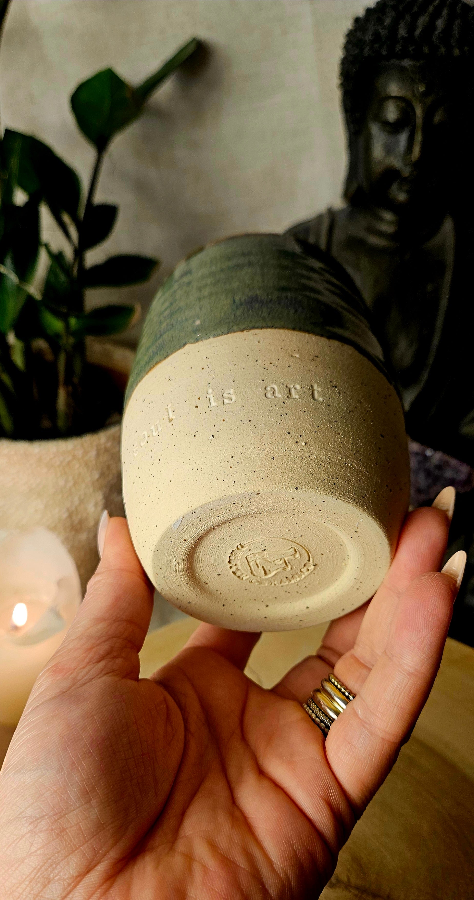 Jeder Becher und Tasse werden von mir in liebevoller Handarbeit auf der Drehscheibe gedreht, von Hand glasiert und anschließend im Brennofen gebrannt. Ich stelle überwiegend Spirituelle Keramik her. In meinen hoch Meditativen Arbeitsprozessen, fließen Weltthemen mit mir und durch mich hindurch. Diese macht sie geradezu ganz besonders und zu einem absoluten kraftvollen Schatz.
