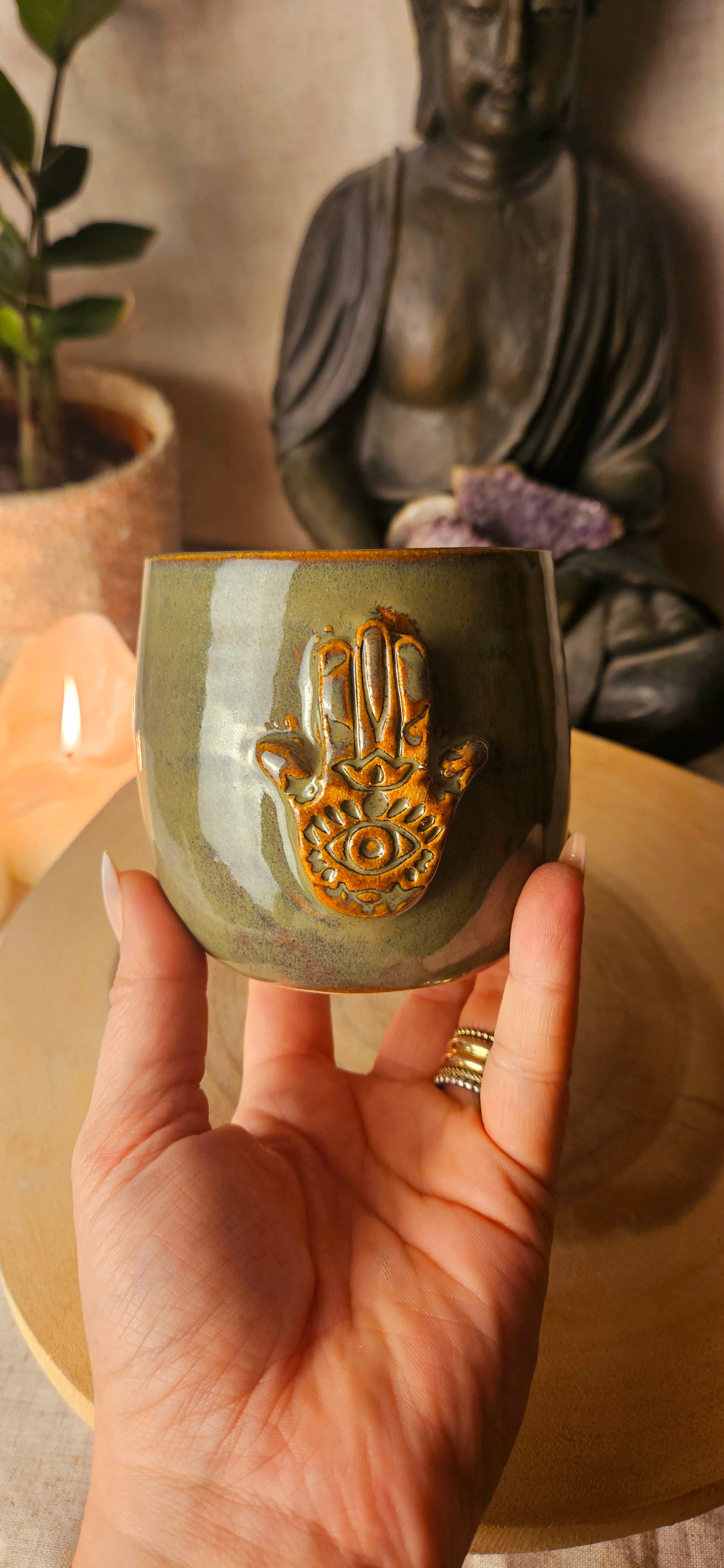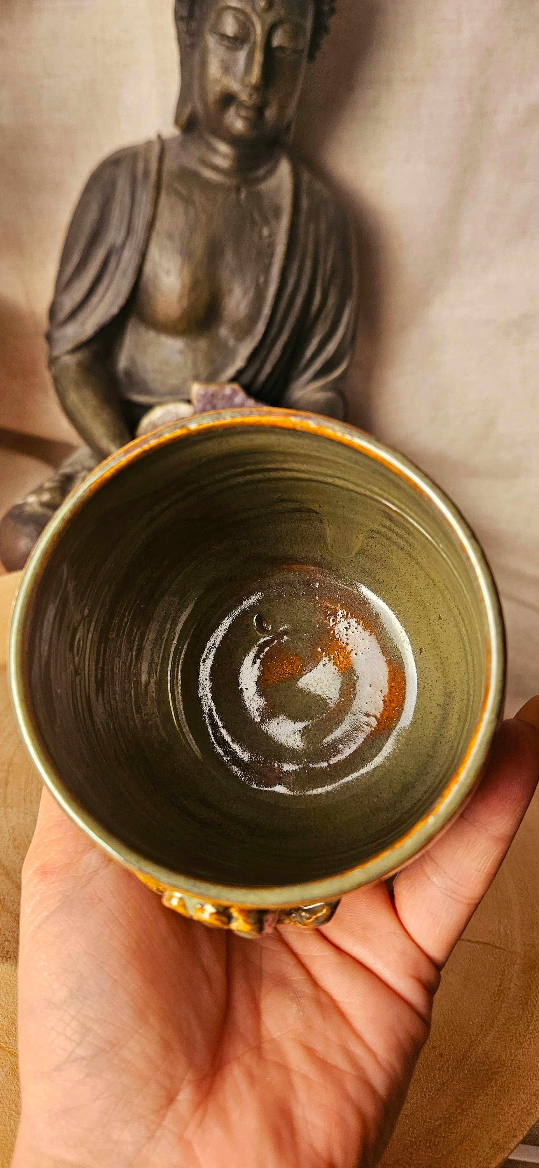 Jeder Becher und Tasse werden von mir in liebevoller Handarbeit auf der Drehscheibe gedreht, von Hand glasiert und anschließend im Brennofen gebrannt. Ich stelle überwiegend Spirituelle Keramik her. In meinen hoch Meditativen Arbeitsprozessen, fließen Weltthemen mit mir und durch mich hindurch. Diese macht sie geradezu ganz besonders und zu einem absoluten kraftvollen Schatz.