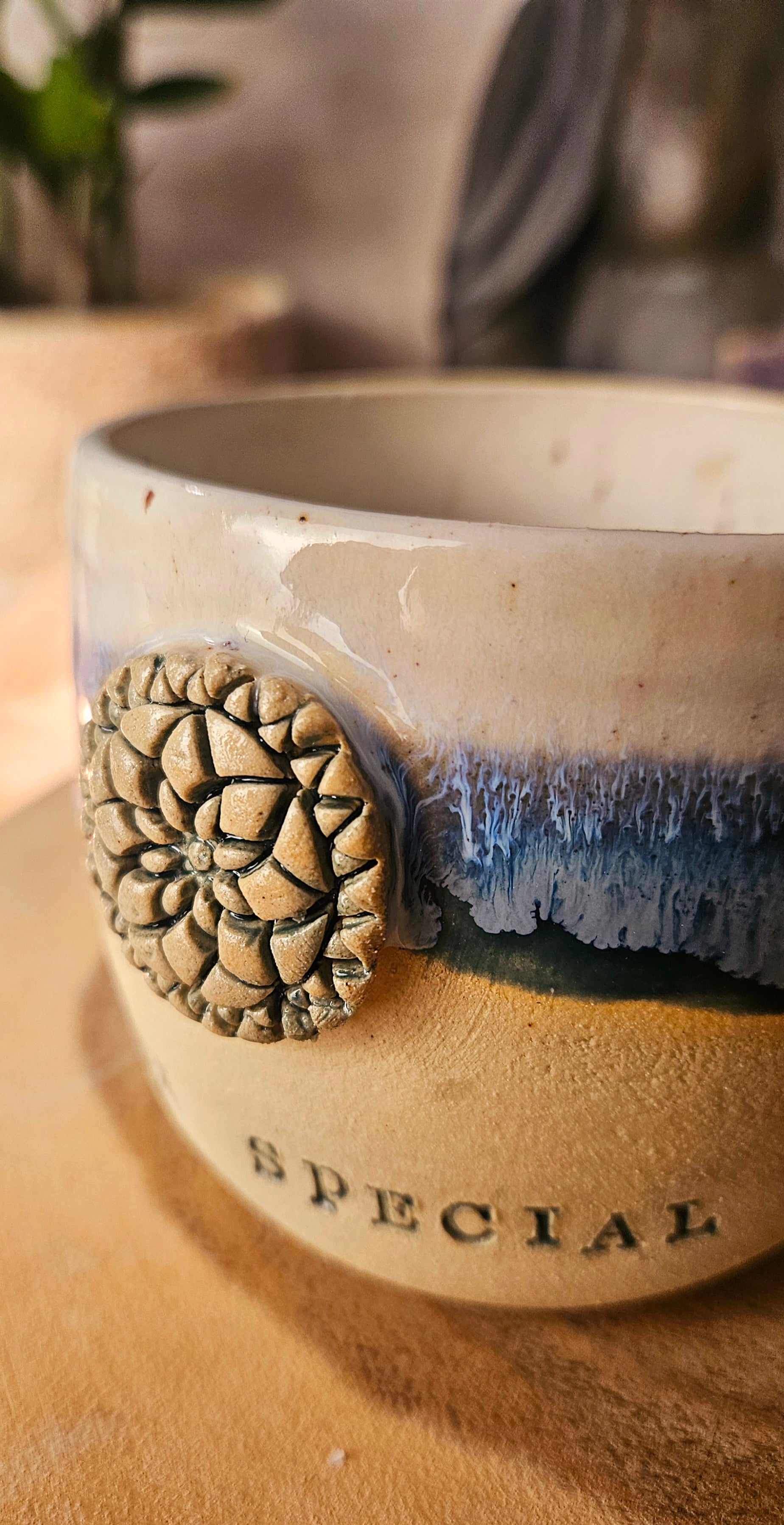 Jeder Becher und Tasse werden von mir in liebevoller Handarbeit auf der Drehscheibe gedreht, von Hand glasiert und anschließend im Brennofen gebrannt. Ich stelle überwiegend Spirituelle Keramik her. In meinen hoch Meditativen Arbeitsprozessen, fließen Weltthemen mit mir und durch mich hindurch. Diese macht sie geradezu ganz besonders und zu einem absoluten kraftvollen Schatz.