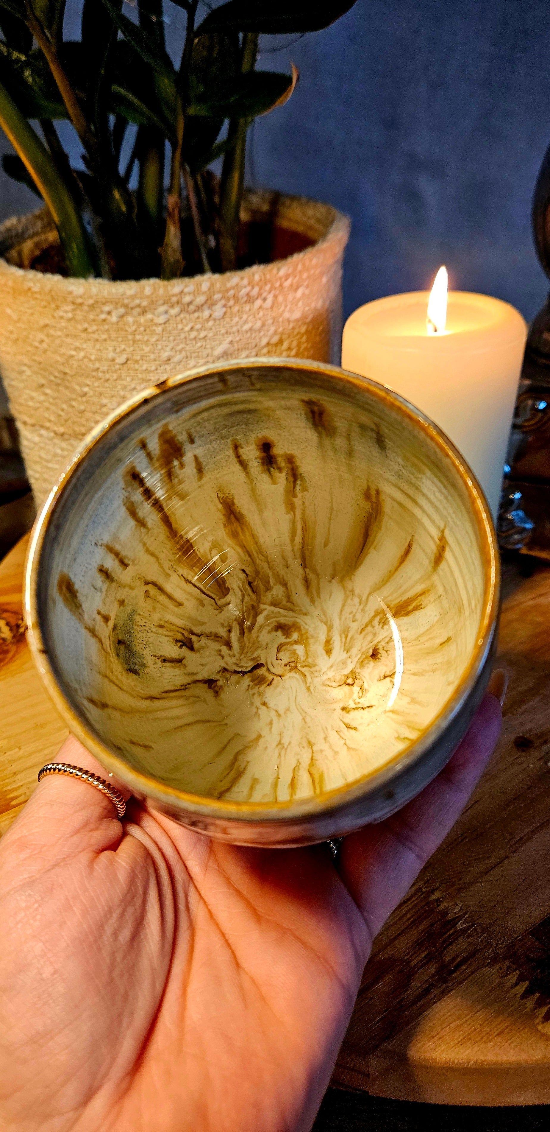 Jeder Becher und Tasse werden von mir in liebevoller Handarbeit auf der Drehscheibe gedreht, von Hand glasiert und anschließend im Brennofen gebrannt. Ich stelle überwiegend Spirituelle Keramik her. In meinen hoch Meditativen Arbeitsprozessen, fließen Weltthemen mit mir und durch mich hindurch. Diese macht sie geradezu ganz besonders und zu einem absoluten kraftvollen Schatz.