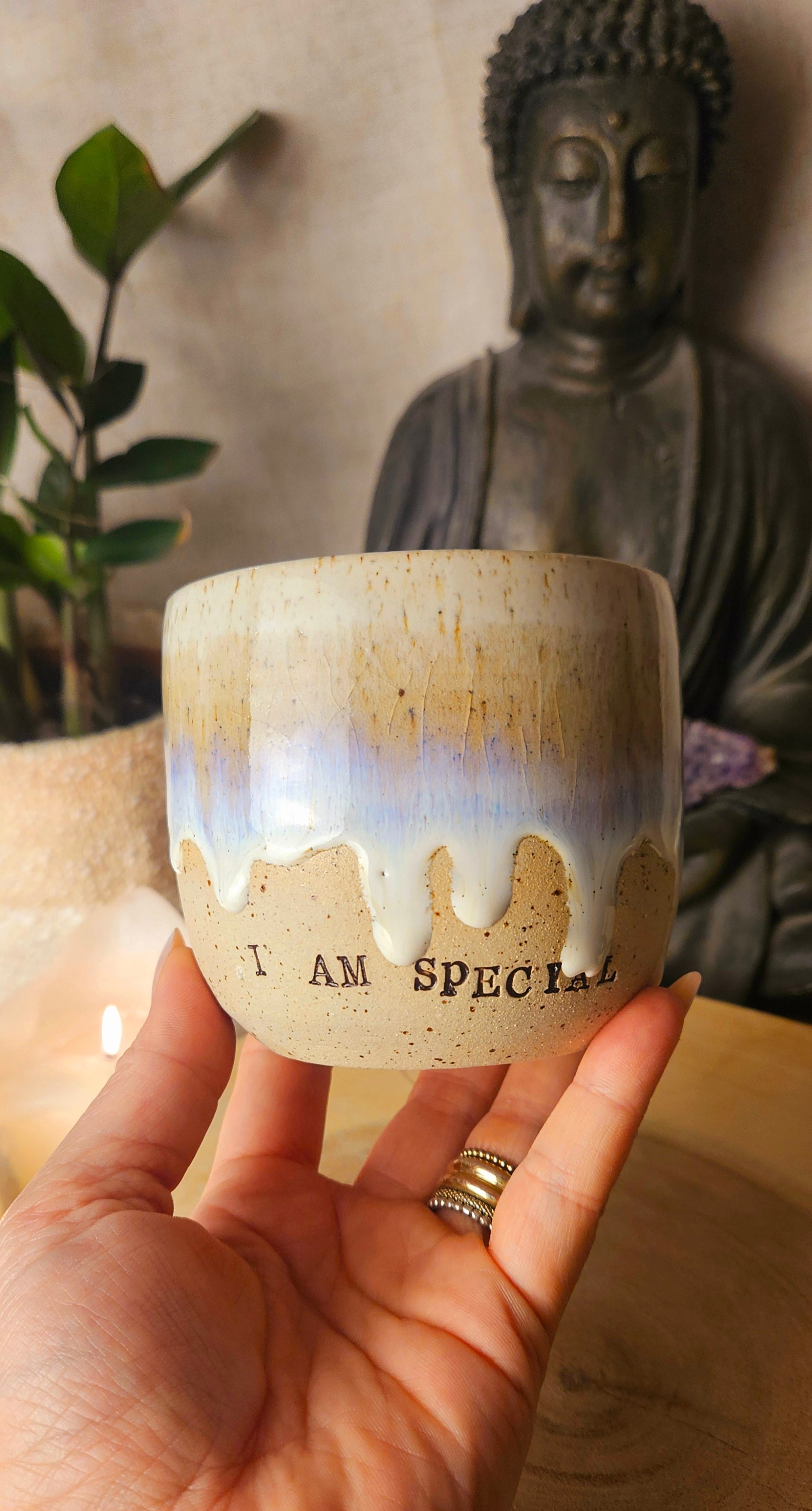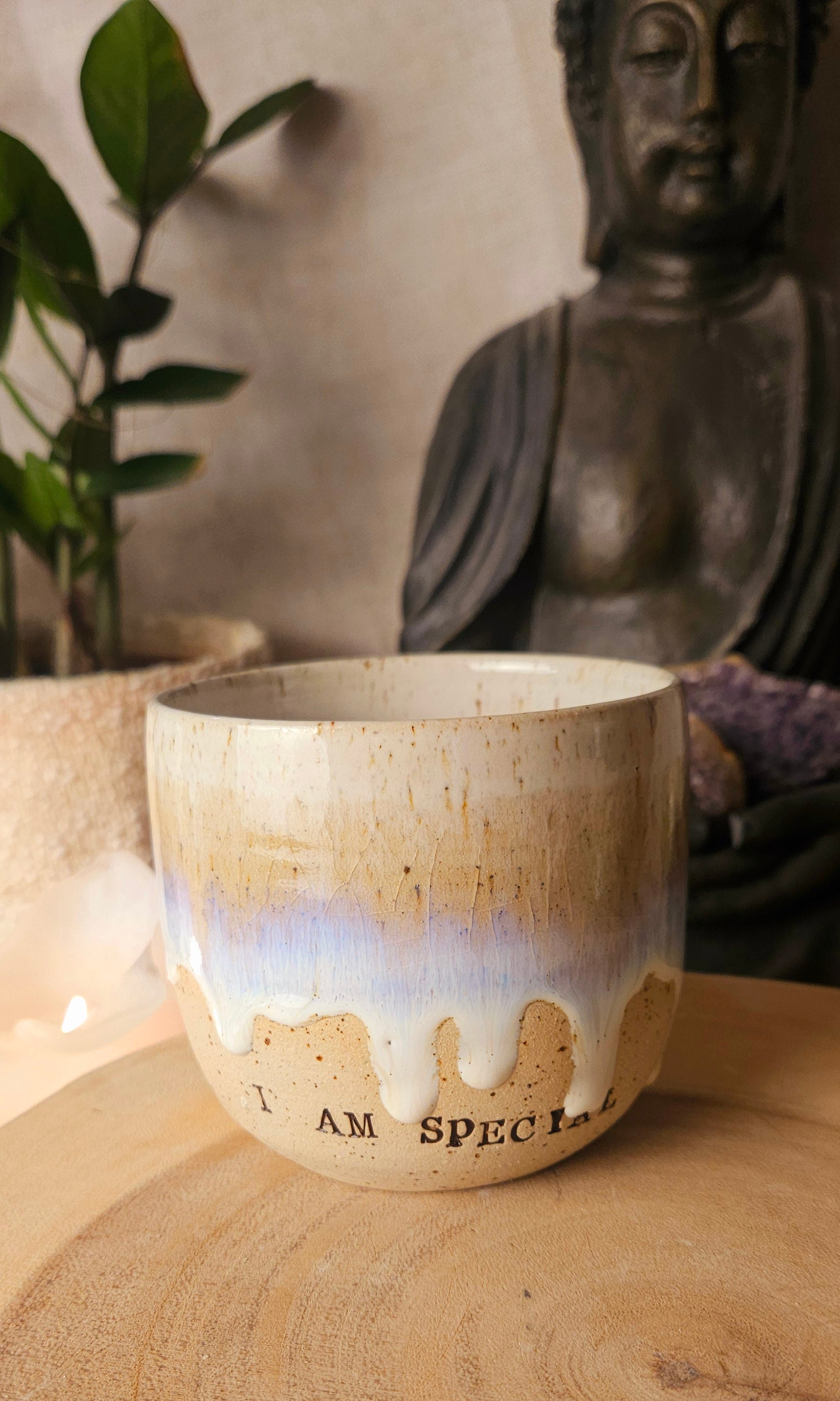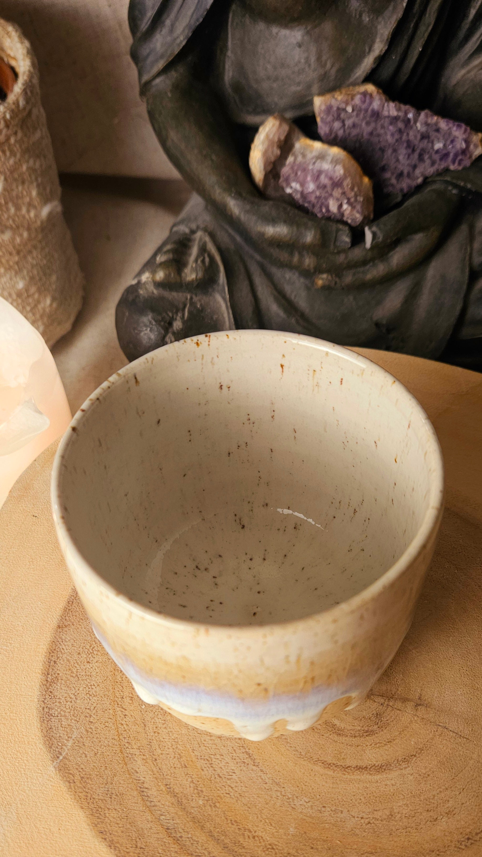 Jeder Becher und Tasse werden von mir in liebevoller Handarbeit auf der Drehscheibe gedreht, von Hand glasiert und anschließend im Brennofen gebrannt. Ich stelle überwiegend Spirituelle Keramik her. In meinen hoch Meditativen Arbeitsprozessen, fließen Weltthemen mit mir und durch mich hindurch. Diese macht sie geradezu ganz besonders und zu einem absoluten kraftvollen Schatz.