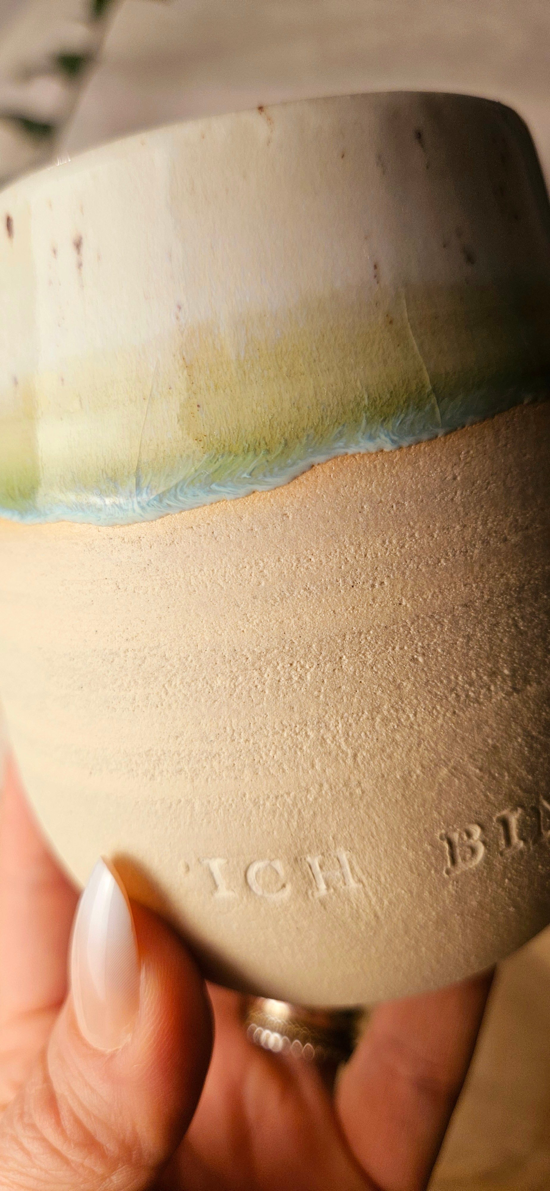 Jeder Becher und Tasse werden von mir in liebevoller Handarbeit auf der Drehscheibe gedreht, von Hand glasiert und anschließend im Brennofen gebrannt. Ich stelle überwiegend Spirituelle Keramik her. In meinen hoch Meditativen Arbeitsprozessen, fließen Weltthemen mit mir und durch mich hindurch. Diese macht sie geradezu ganz besonders und zu einem absoluten kraftvollen Schatz.