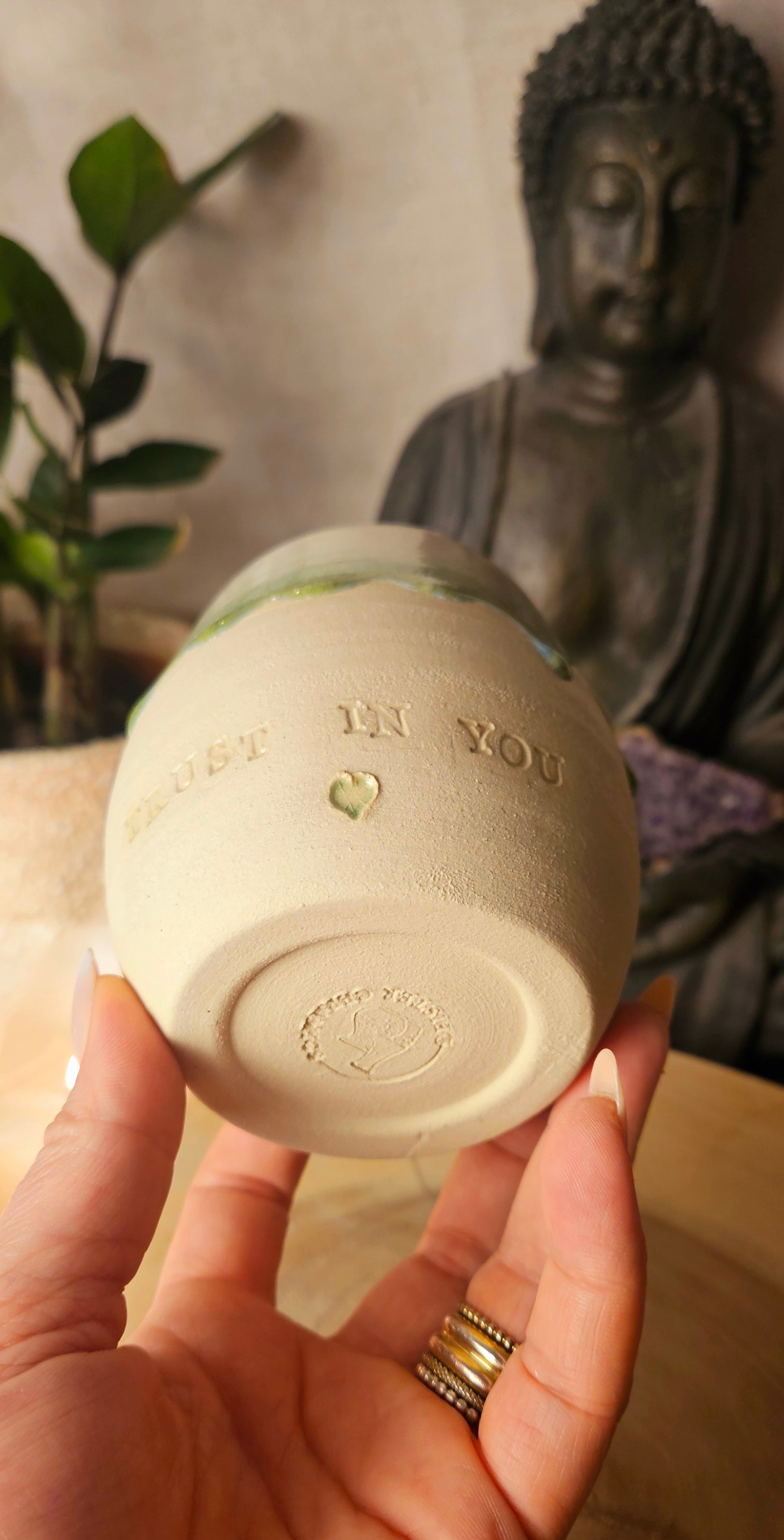 Jeder Becher und Tasse werden von mir in liebevoller Handarbeit auf der Drehscheibe gedreht, von Hand glasiert und anschließend im Brennofen gebrannt. Ich stelle überwiegend Spirituelle Keramik her. In meinen hoch Meditativen Arbeitsprozessen, fließen Weltthemen mit mir und durch mich hindurch. Diese macht sie geradezu ganz besonders und zu einem absoluten kraftvollen Schatz.