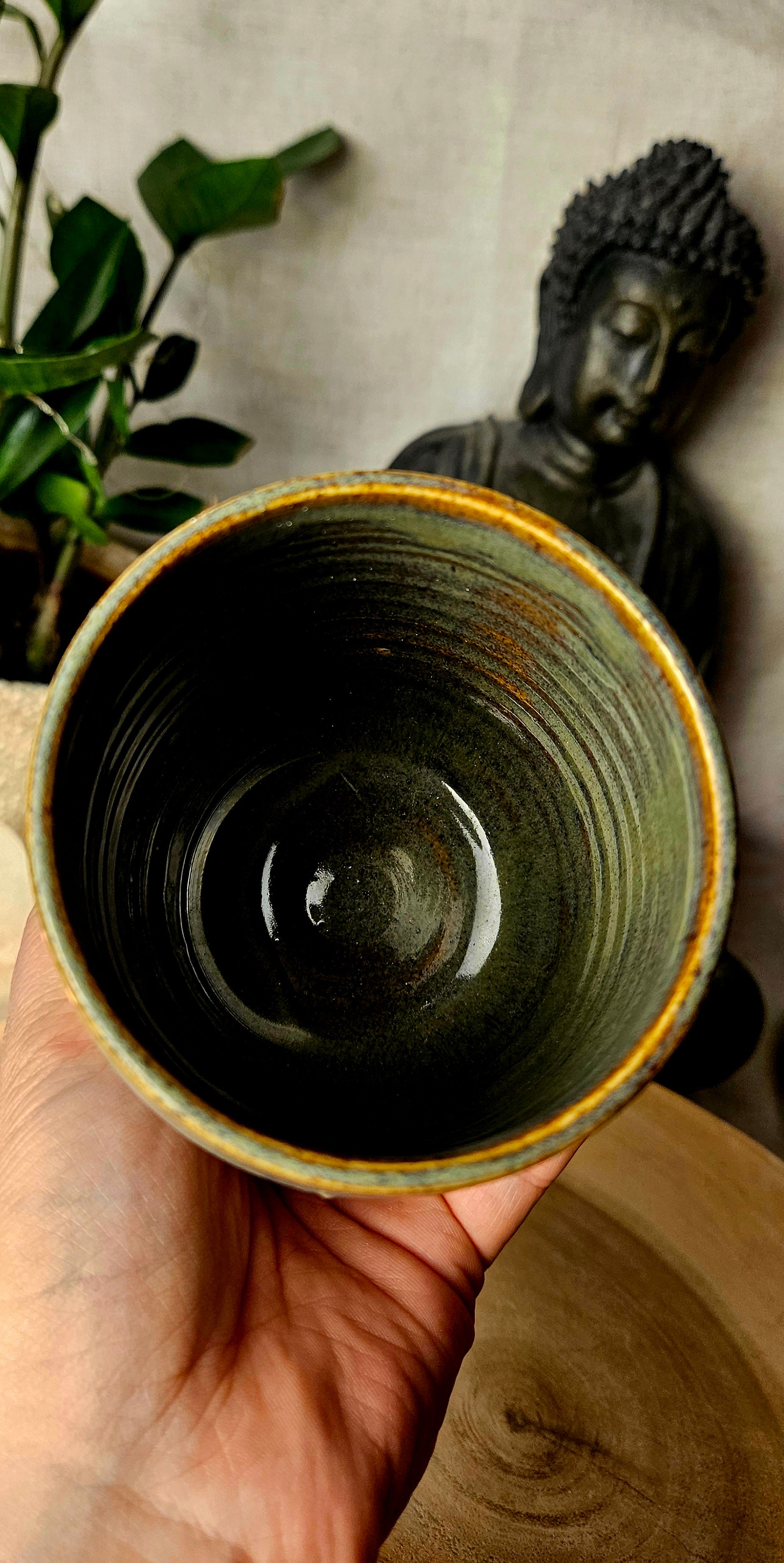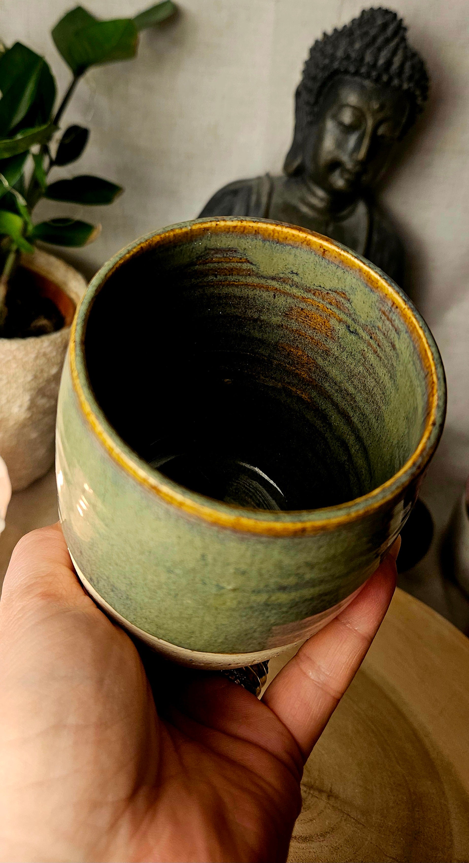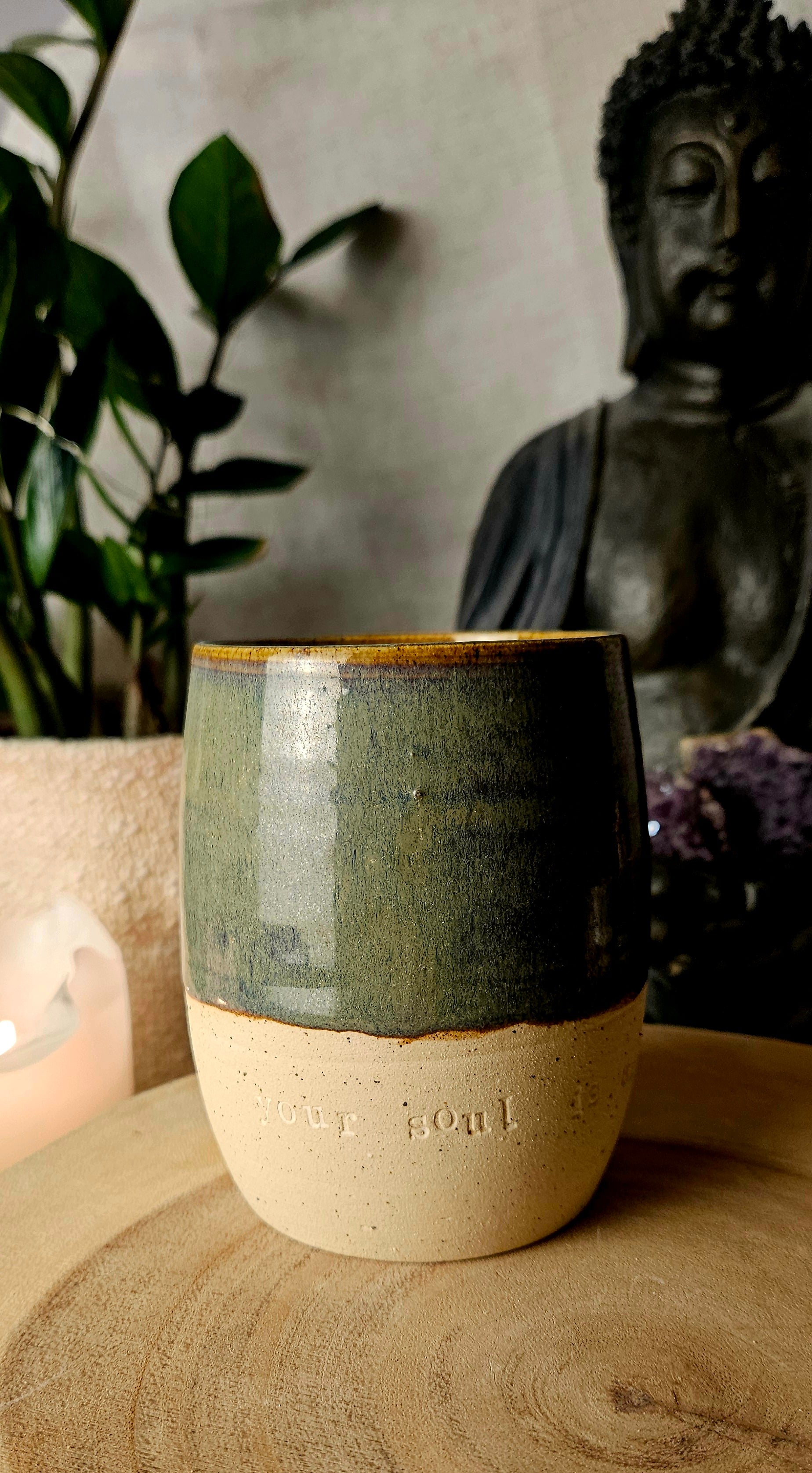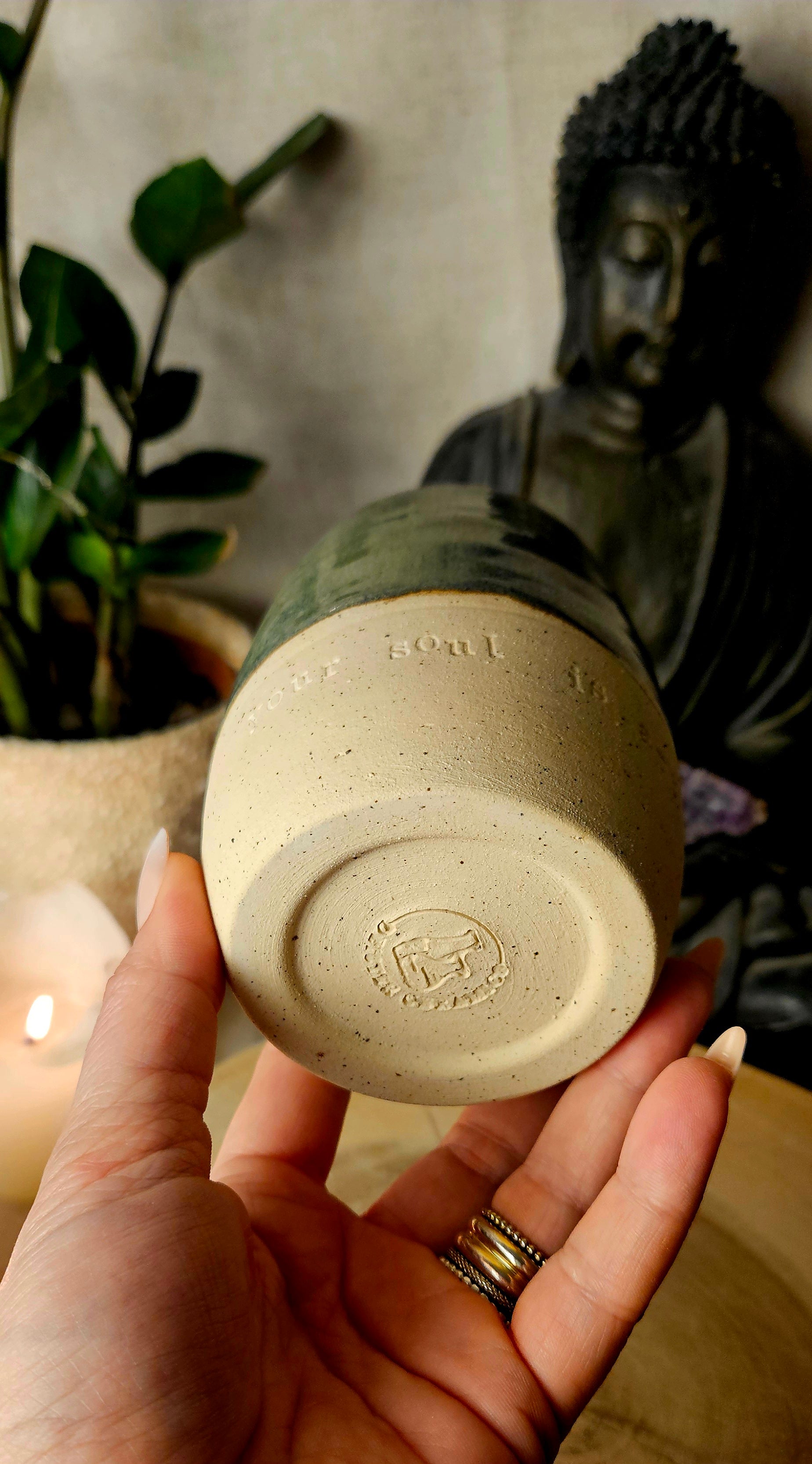 Jeder Becher und Tasse werden von mir in liebevoller Handarbeit auf der Drehscheibe gedreht, von Hand glasiert und anschließend im Brennofen gebrannt. Ich stelle überwiegend Spirituelle Keramik her. In meinen hoch Meditativen Arbeitsprozessen, fließen Weltthemen mit mir und durch mich hindurch. Diese macht sie geradezu ganz besonders und zu einem absoluten kraftvollen Schatz.