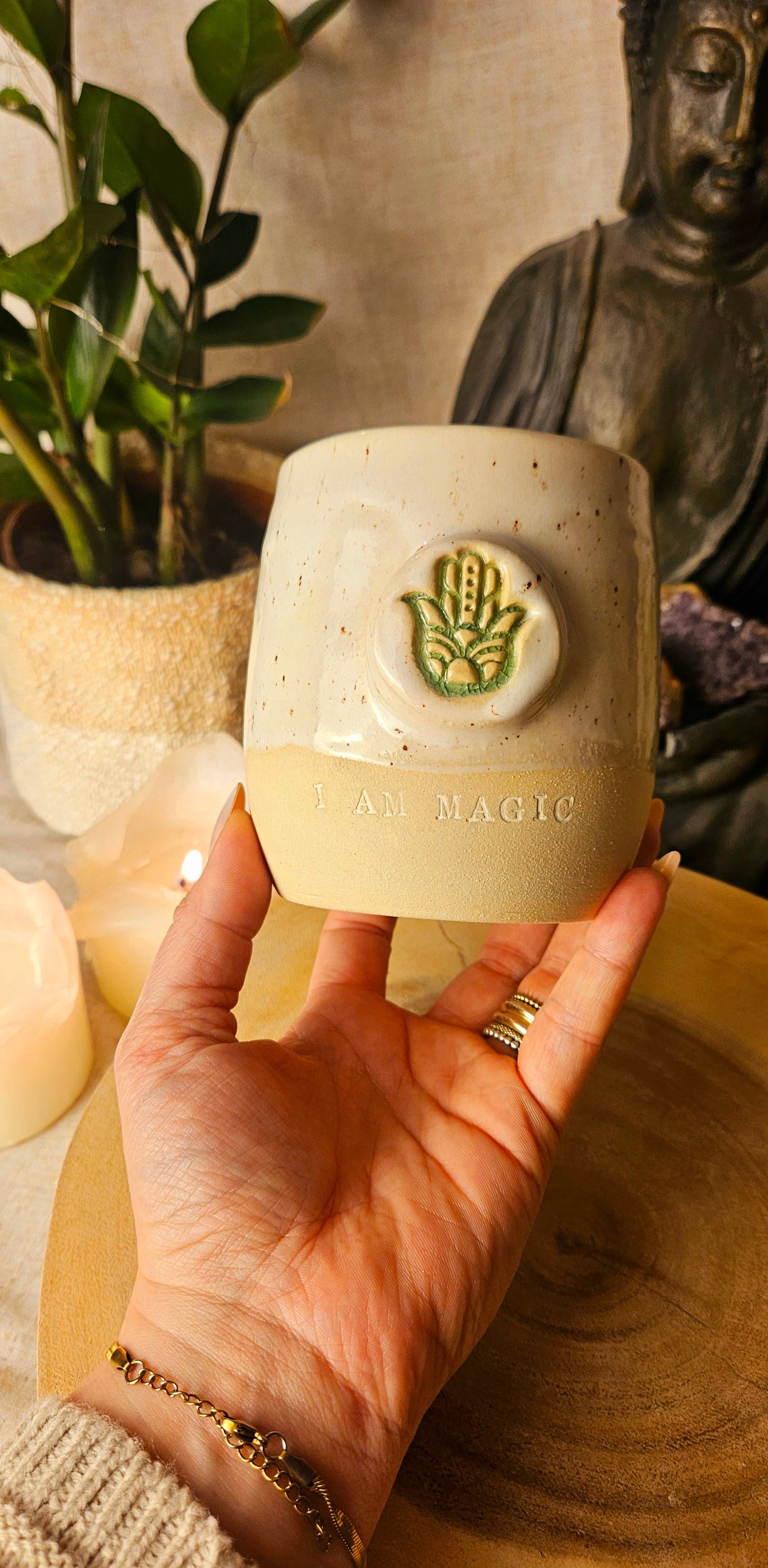 Jeder Becher und Tasse werden von mir in liebevoller Handarbeit auf der Drehscheibe gedreht, von Hand glasiert und anschließend im Brennofen gebrannt. Ich stelle überwiegend Spirituelle Keramik her.  In meinen  hoch Meditativen Arbeitsprozessen, fließen Weltthemen mit mir und durch mich hindurch. Diese macht sie geradezu ganz besonders und zu einem absoluten kraftvollen Schatz.