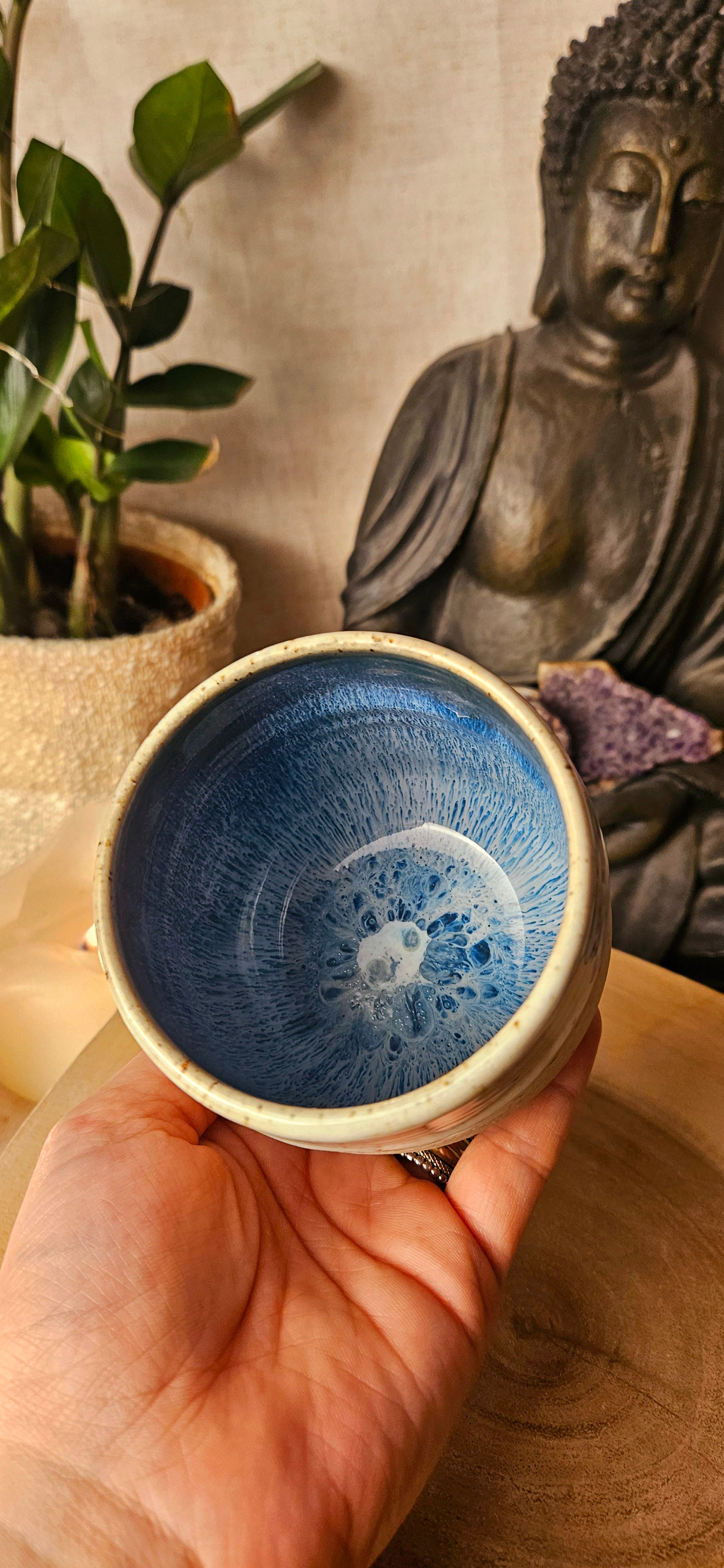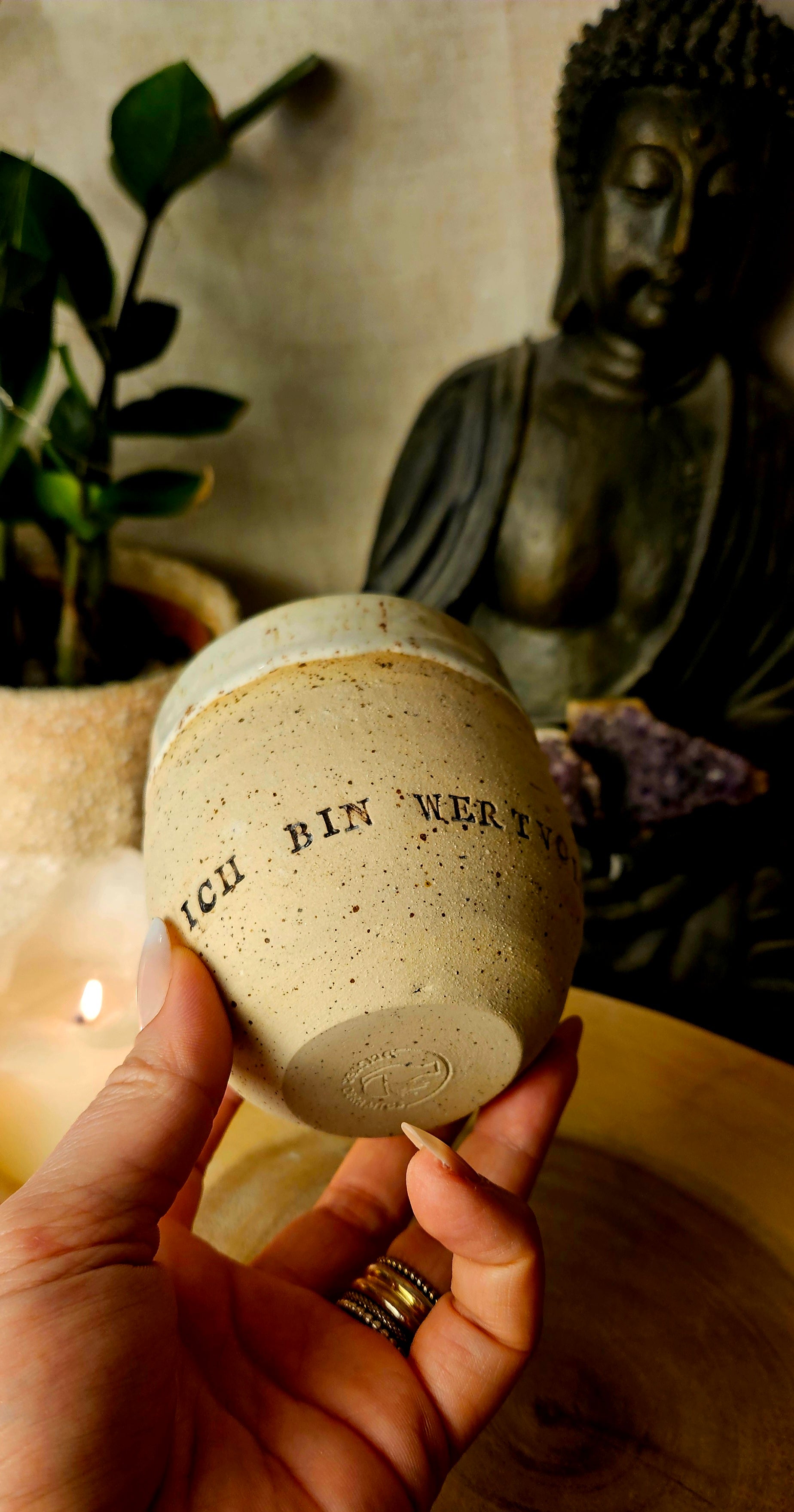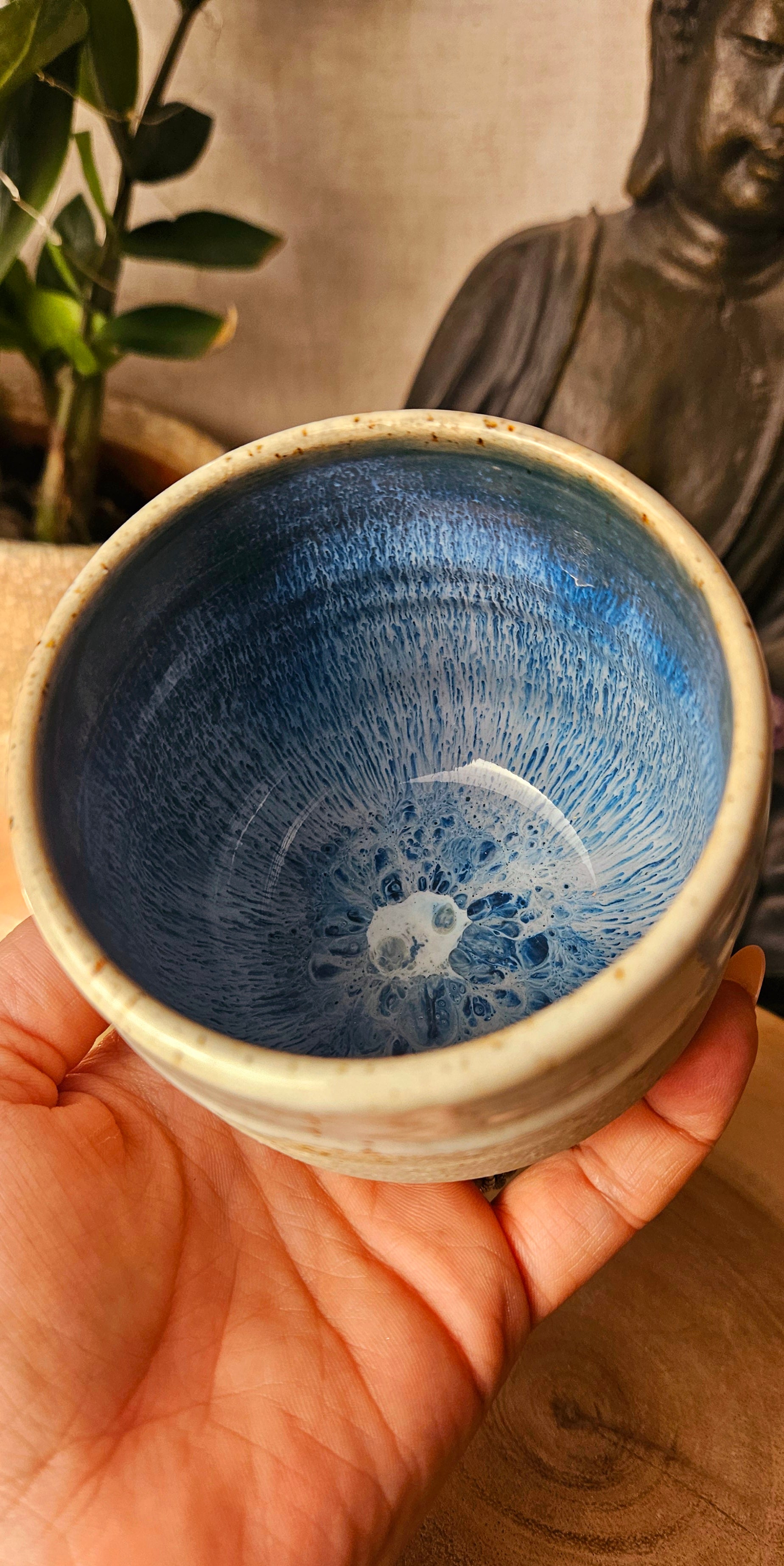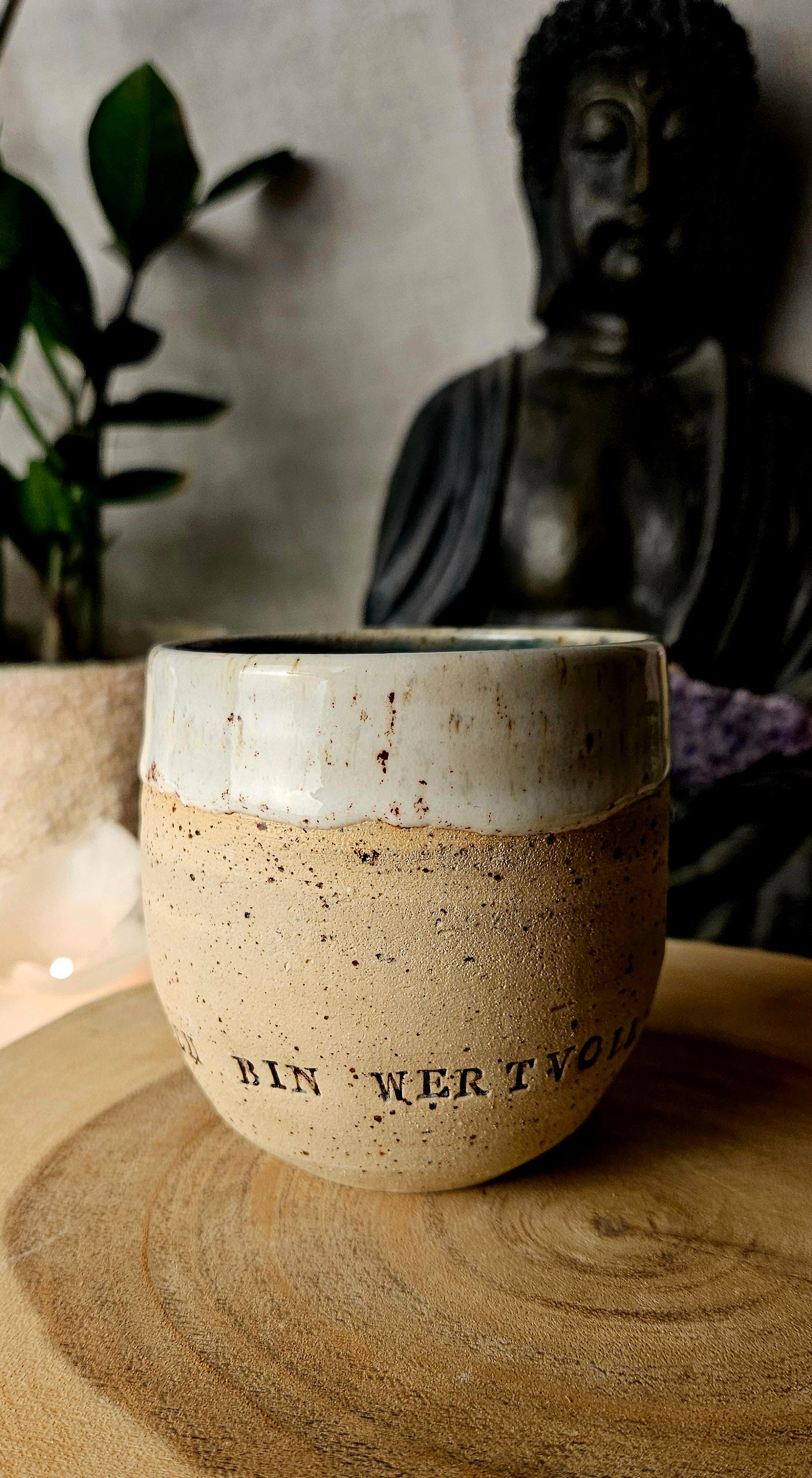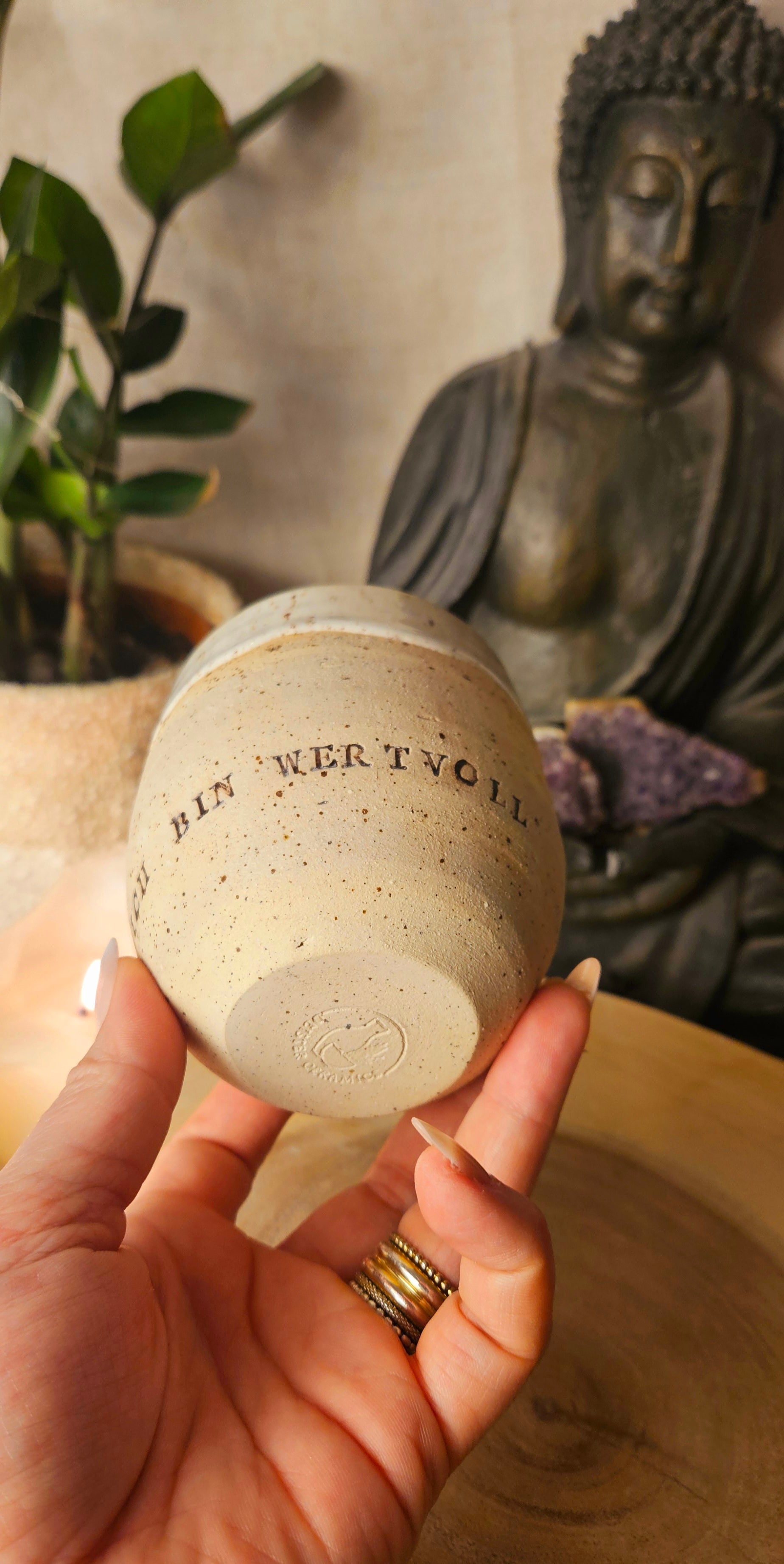 Jeder Becher und Tasse werden von mir in liebevoller Handarbeit auf der Drehscheibe gedreht, von Hand glasiert und anschließend im Brennofen gebrannt. Ich stelle überwiegend Spirituelle Keramik her. In meinen hoch Meditativen Arbeitsprozessen, fließen Weltthemen mit mir und durch mich hindurch. Diese macht sie geradezu ganz besonders und zu einem absoluten kraftvollen Schatz.