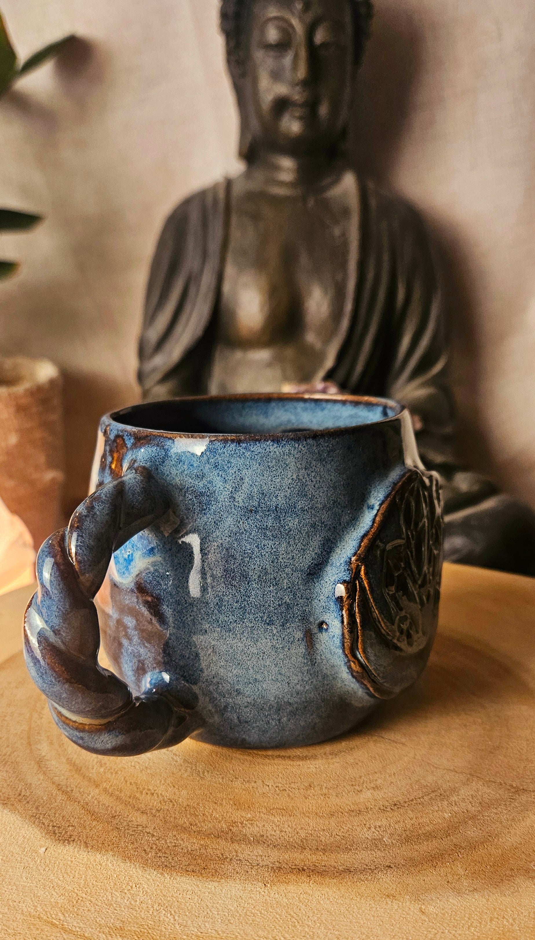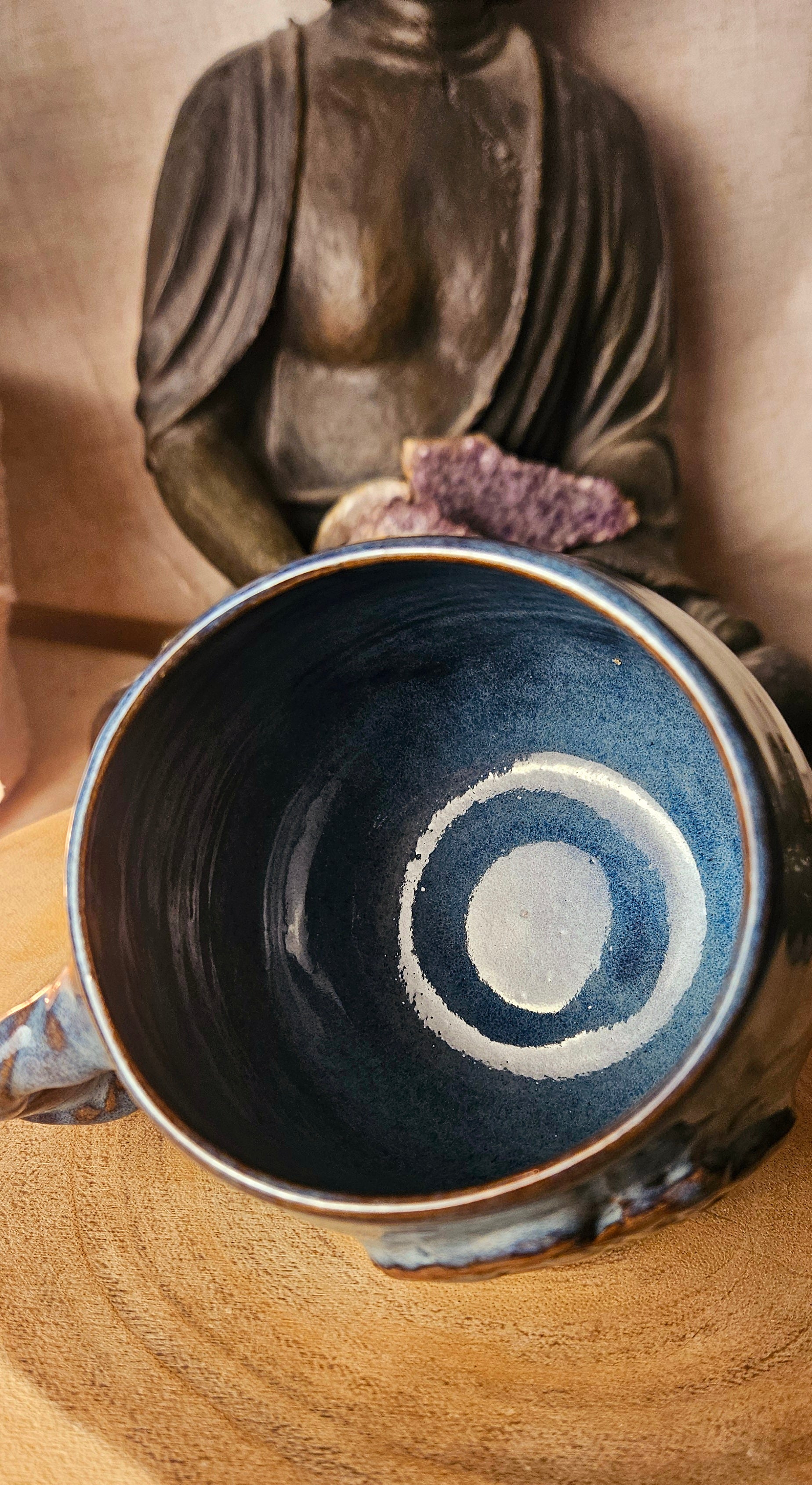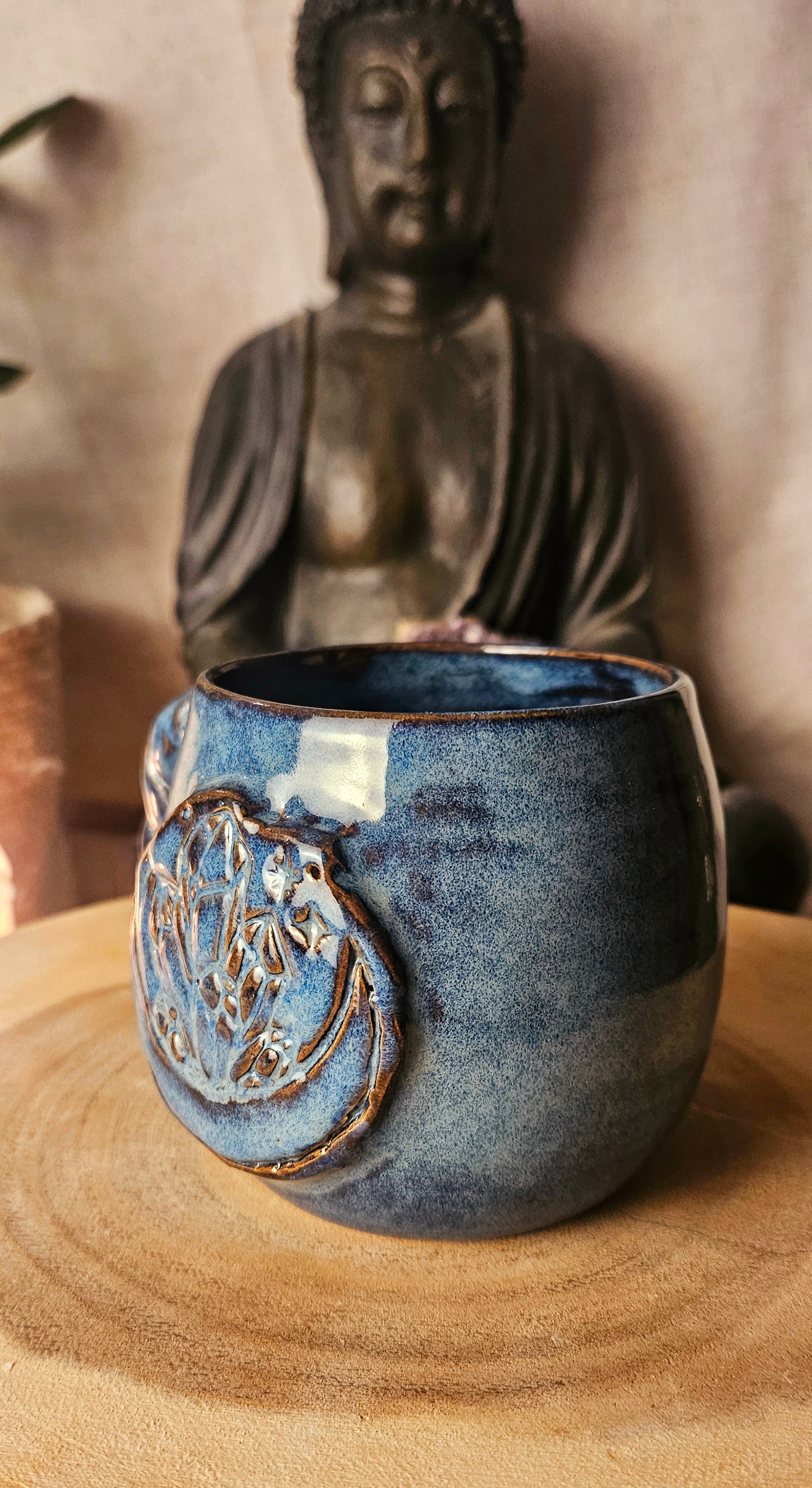 Jeder Becher und Tasse werden von mir in liebevoller Handarbeit auf der Drehscheibe gedreht, von Hand glasiert und anschließend im Brennofen gebrannt. Ich stelle überwiegend Spirituelle Keramik her. In meinen hoch Meditativen Arbeitsprozessen, fließen Weltthemen mit mir und durch mich hindurch. Diese macht sie geradezu ganz besonders und zu einem absoluten kraftvollen Schatz.